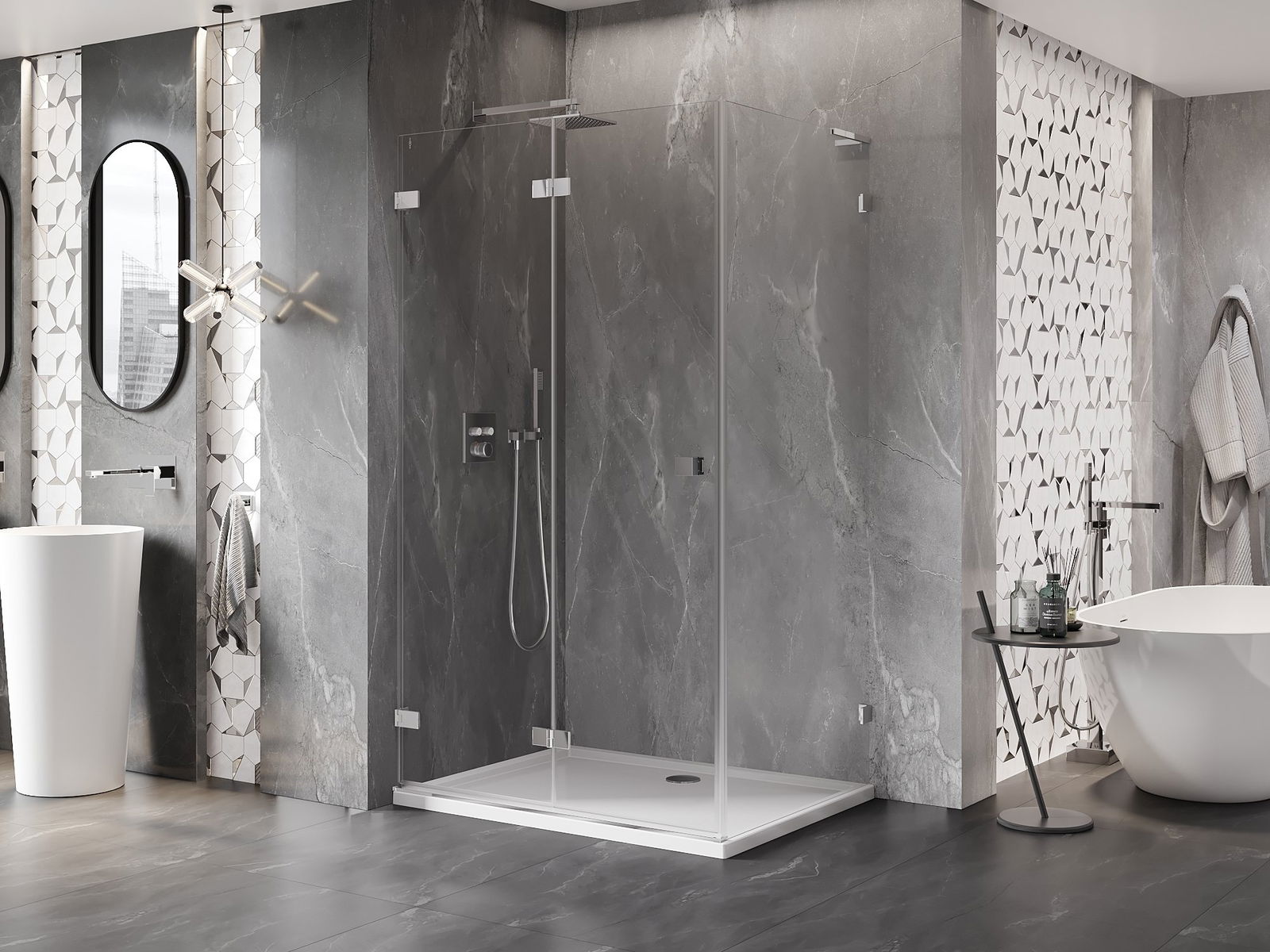 Der praktische und bequeme Griff bestand aus langlebigem und widerstandsfähigem Metall. Die modische Form in Kombination mit einem auf die Farbe der Profile zugeschnittenen Finish verleiht dem Ganzen einen modernen und stilvollen Look und betont die Ästhetik jedes Badezimmers.