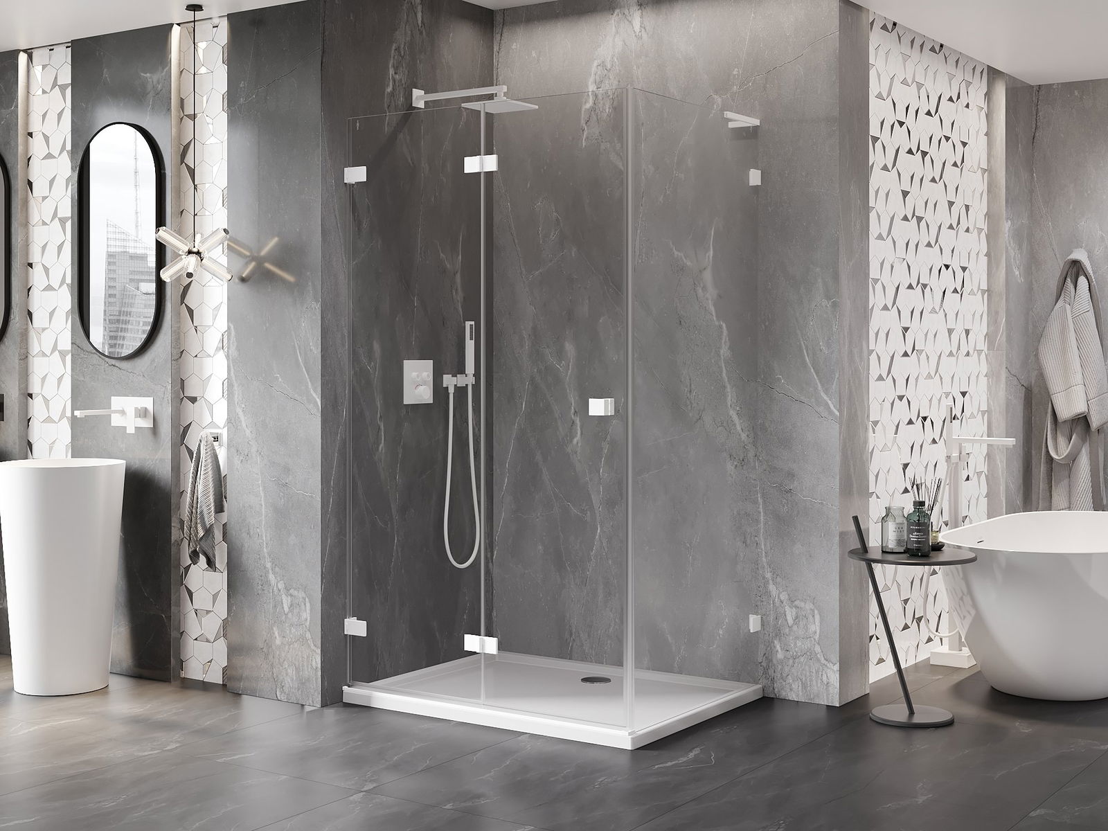 Die Klemmen und Scharniere sind aus sehr haltbarem Messing gefertigt und schließen bündig mit der Glasscheibe ab. Es handelt sich um eine ausgezeichnete Wahl, die Eleganz, Haltbarkeit und modernes Design vereint. Dank solcher Lösungen gewinnen Duschabtrennungen an Ästhetik, während sie gleichzeitig über viele Jahre hinweg eine hohe Funktionalität und Haltbarkeit beibehalten.