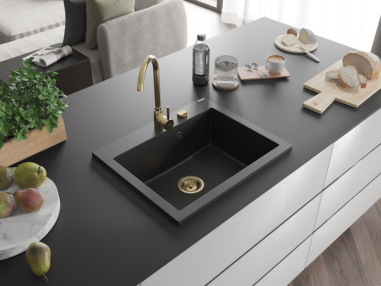 Die Spüle besteht aus hochwertigem Granit. Es ist eine elegante und vor allem praktische Ergänzung zu jeder Küche, unabhängig von ihrem Stil. Hohe Qualität und Granitdauer sorgen für eine langjährige Nutzung.