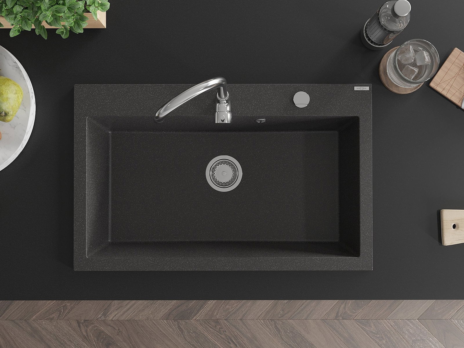 Die Spüle besteht aus hochwertigem Granit. Es ist eine elegante und vor allem praktische Ergänzung zu jeder Küche, unabhängig von ihrem Stil. Hohe Qualität und Granitdauer sorgen für eine langjährige Nutzung.