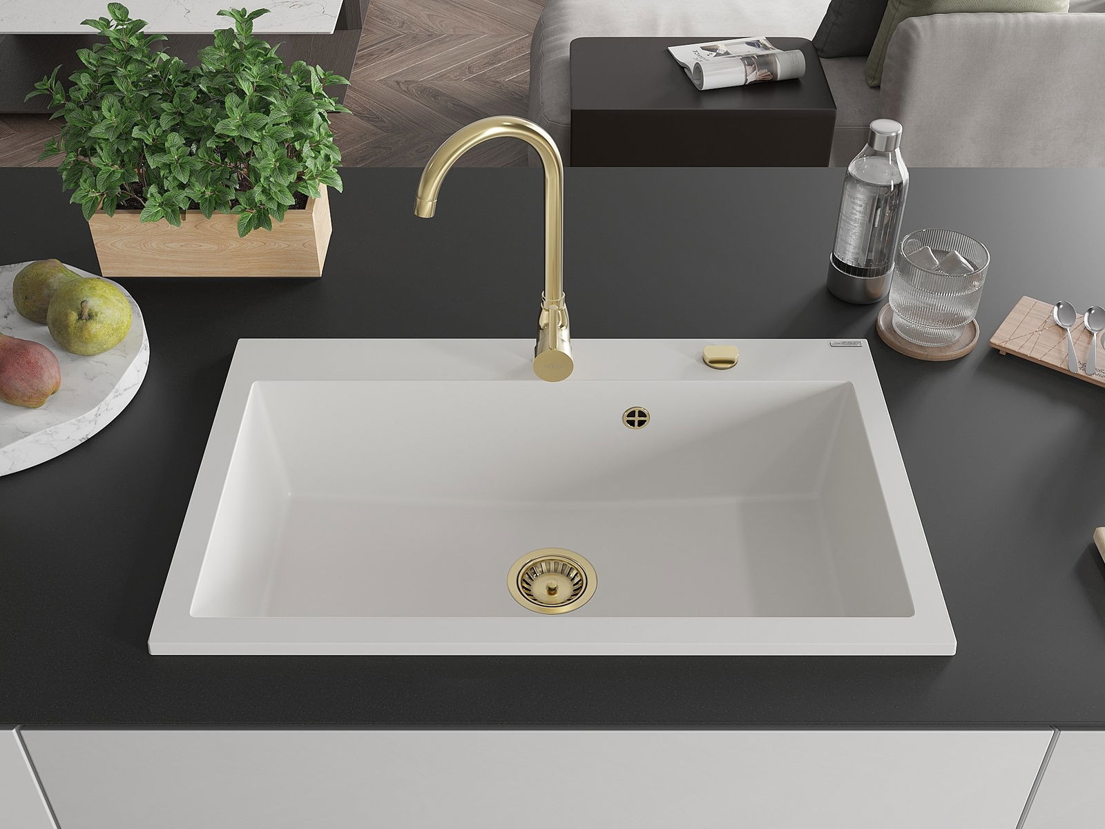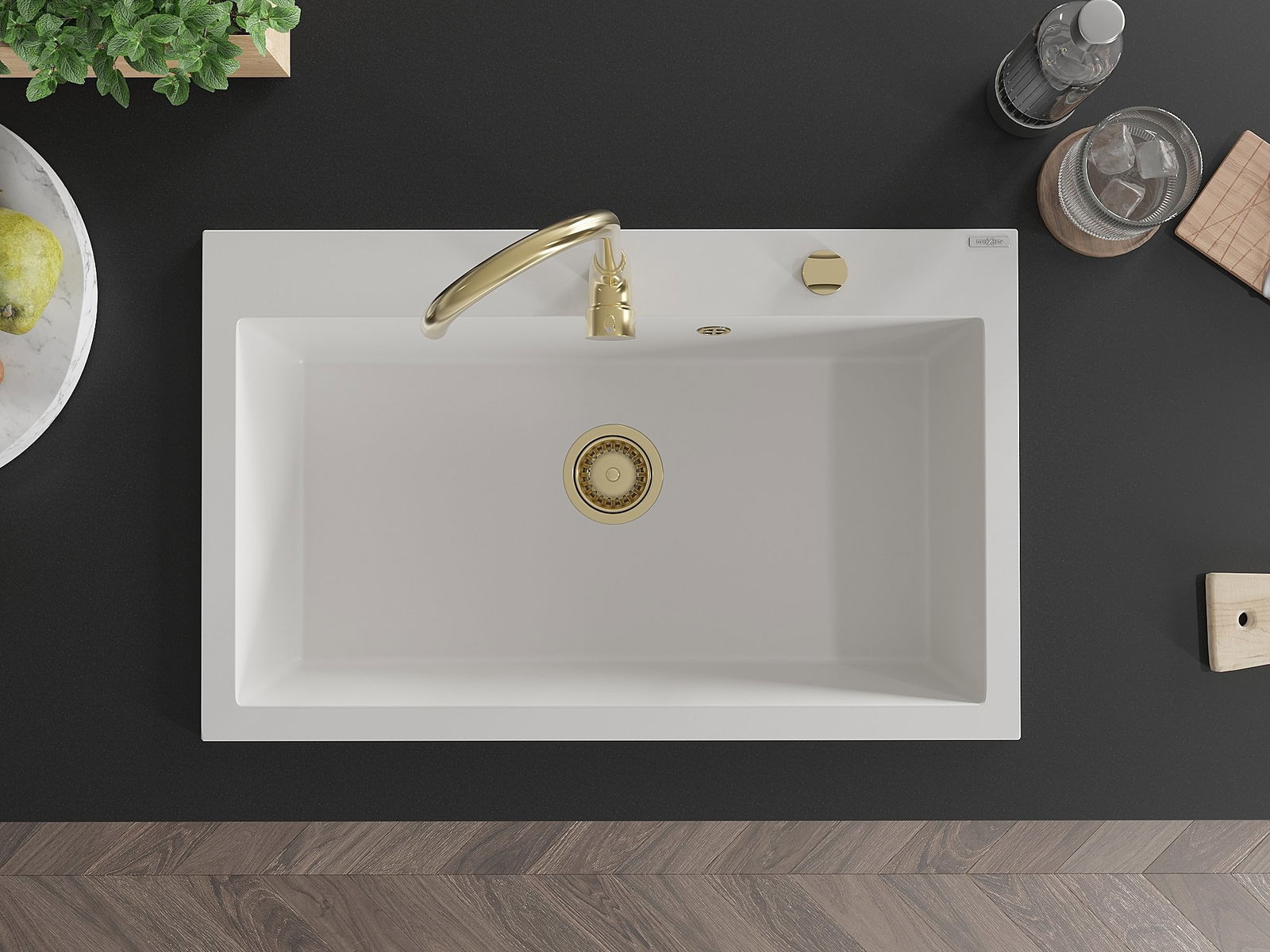 Mexen Elix Granitspüle 1-beckig 800 x 500 mm, weiß, goldener Siphon - 6527801005-20-G