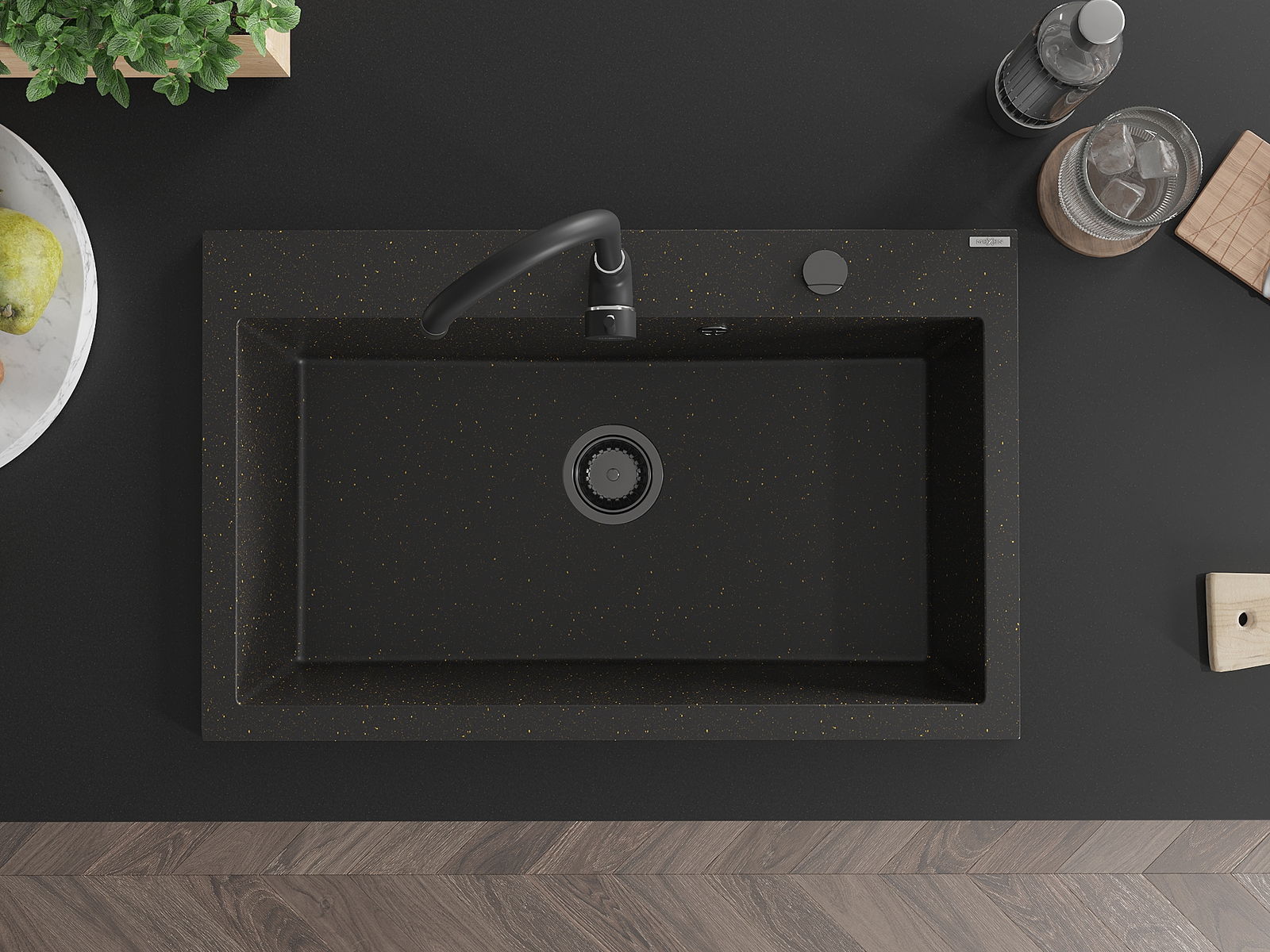 Mexen Elix Granitspüle 1-becken 800 x 500 mm, schwarz/gold metallic, schwarzer Siphon - 6527801005-75-B