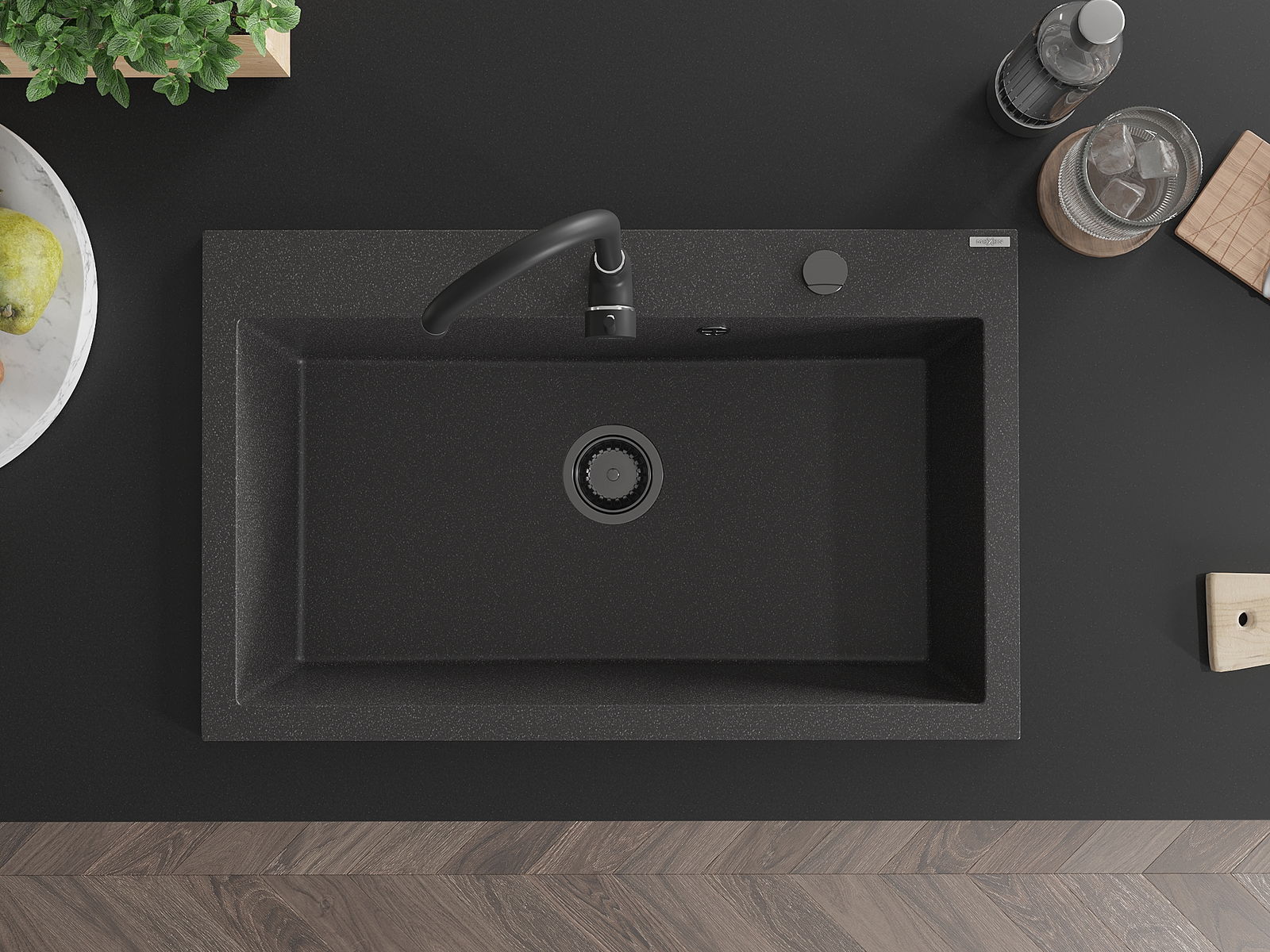 Die Spüle besteht aus hochwertigem Granit. Es ist eine elegante und vor allem praktische Ergänzung zu jeder Küche, unabhängig von ihrem Stil. Hohe Qualität und Granitdauer sorgen für eine langjährige Nutzung.