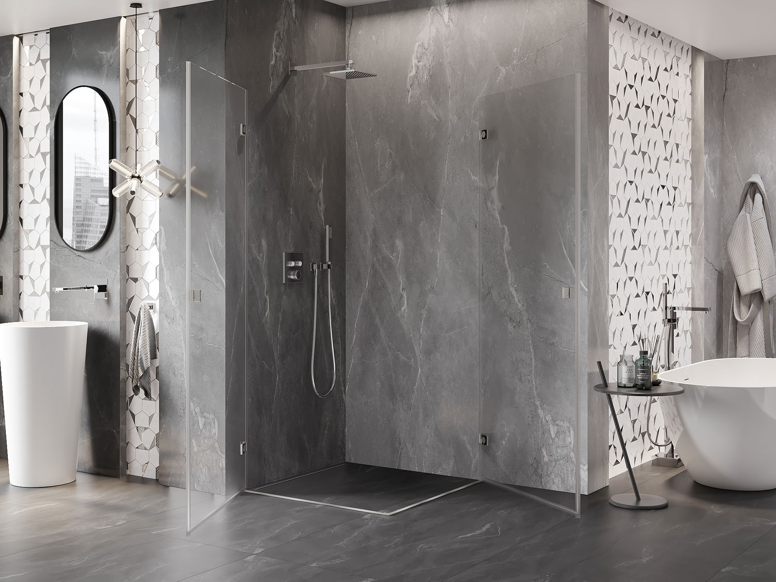 Das Produkt kann je nach Bedarf sowohl auf einer Duschwanne als auch direkt auf dem Boden montiert werden. Die universelle Montagemethode ermöglicht die Anpassung des Produkts an verschiedene Arten von Badezimmern und Raumkonfigurationen.