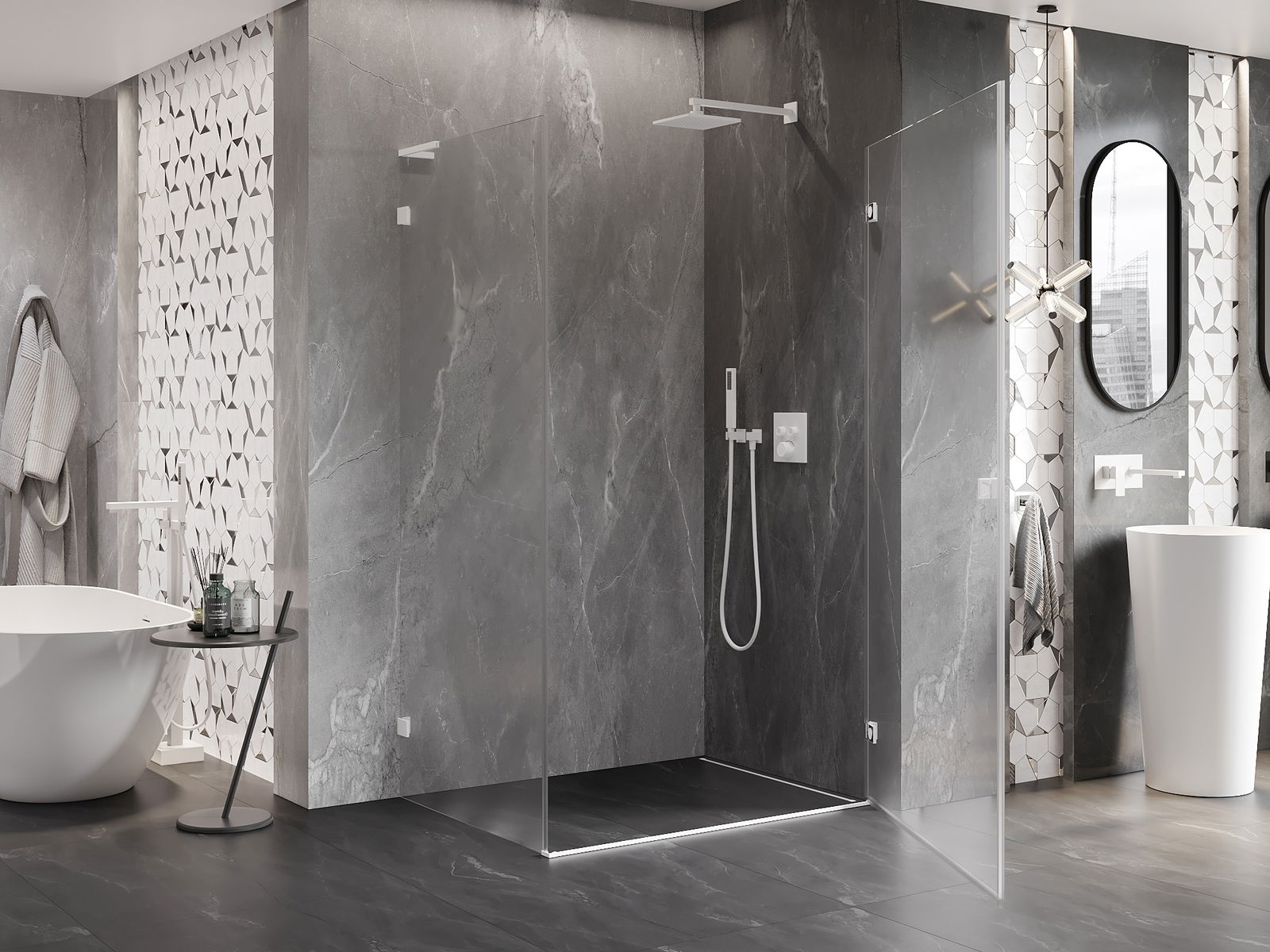 Die Klammern bestehen aus sehr haltbarem Messing und bilden zusätzlich eine flächenbündige Glasscheibe. Dies ist eine ausgezeichnete Wahl, die Eleganz, Haltbarkeit und modernes Design verbindet. Dank solcher Lösungen gewinnt die Dusche an Ästhetik und erleichtert gleichzeitig die Sauberkeit.