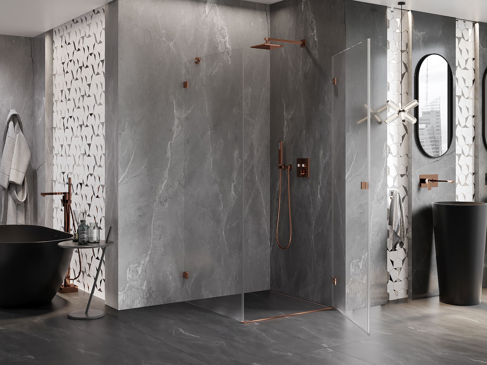 Die Klammern bestehen aus sehr haltbarem Messing und bilden zusätzlich eine flächenbündige Glasscheibe. Dies ist eine ausgezeichnete Wahl, die Eleganz, Haltbarkeit und modernes Design verbindet. Dank solcher Lösungen gewinnt die Dusche an Ästhetik und erleichtert gleichzeitig die Sauberkeit.