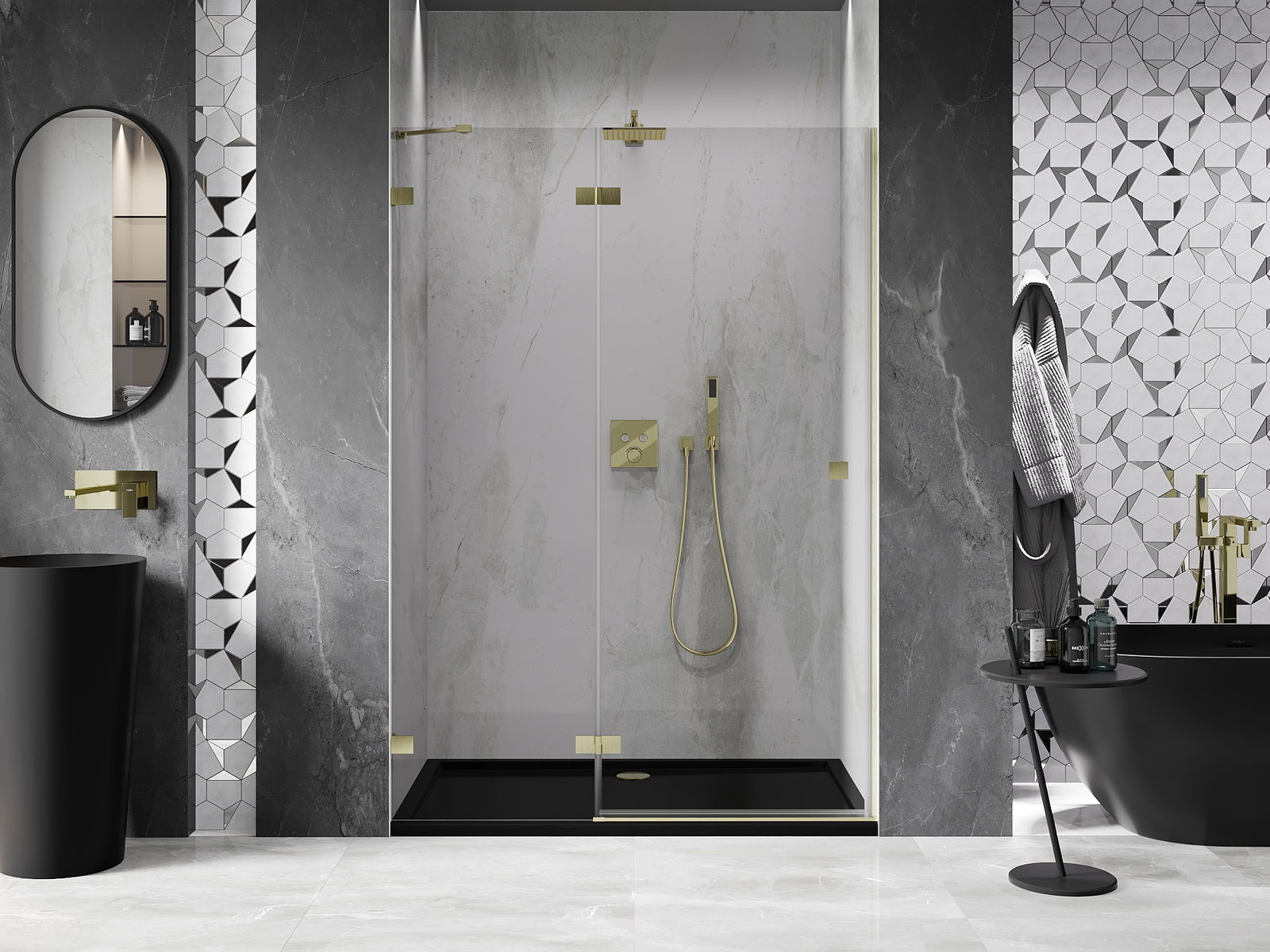 Das Produkt kann je nach Bedarf sowohl auf einer Duschwanne als auch direkt auf dem Boden montiert werden. Die universelle Montagemethode ermöglicht die Anpassung des Produkts an verschiedene Arten von Badezimmern und Raumkonfigurationen.