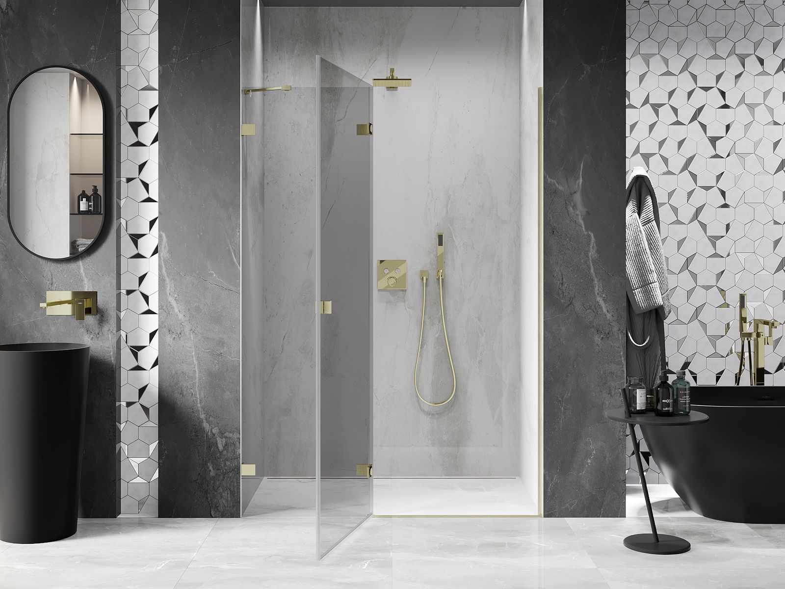Der handliche und bequeme Griff besteht aus langlebigem und widerstandsfähigem Metall. Die modische Form in Kombination mit einer farblich auf die Profile abgestimmten Oberflächenveredelung verleiht dem Ganzen ein modernes und stilvolles Erscheinungsbild und betont die Ästhetik jedes Badezimmers.