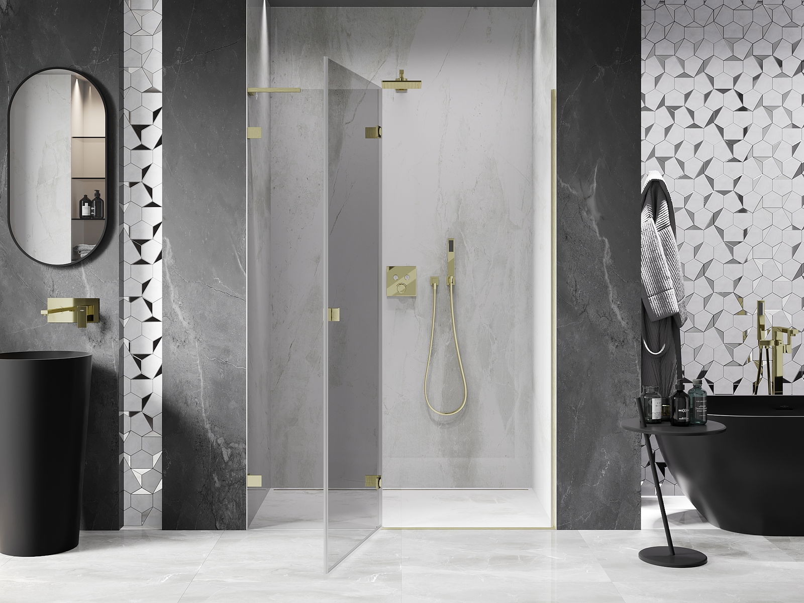Die Klemmen und Scharniere sind aus sehr haltbarem Messing gefertigt und schließen bündig mit der Glasscheibe ab. Es handelt sich um eine ausgezeichnete Wahl, die Eleganz, Haltbarkeit und modernes Design vereint. Dank solcher Lösungen gewinnen Duschabtrennungen an Ästhetik, während sie gleichzeitig über viele Jahre hinweg eine hohe Funktionalität und Haltbarkeit beibehalten.