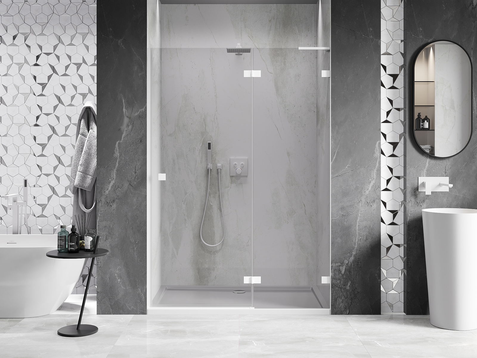 Abhängig von Ihren Bedürfnissen kann das Produkt sowohl auf der Duschschale als auch direkt auf dem Boden montiert werden. Mit der universellen Montagemethode können Sie das Produkt an verschiedene Arten von Badezimmern anpassen und Raum konfigurieren.