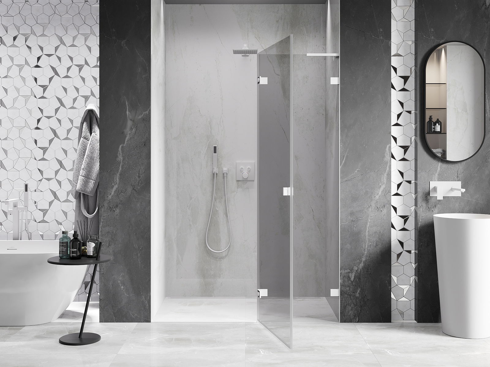 Der praktische und bequeme Griff bestand aus langlebigem und widerstandsfähigem Metall. Die modische Form in Kombination mit einem auf die Farbe der Profile zugeschnittenen Finish verleiht dem Ganzen einen modernen und stilvollen Look und betont die Ästhetik jedes Badezimmers.
