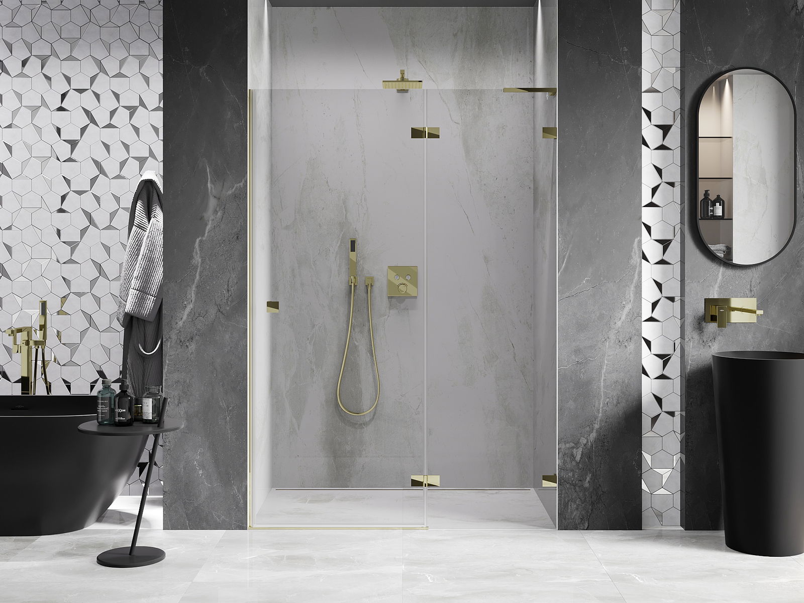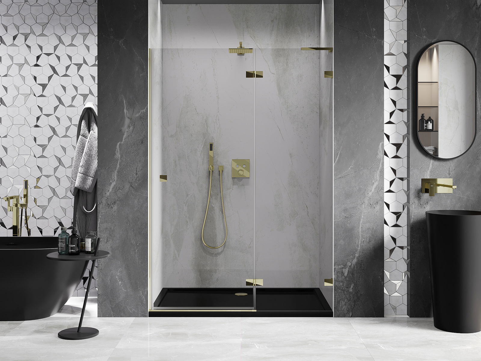 Die Klemmen und Scharniere sind aus sehr haltbarem Messing gefertigt und schließen bündig mit der Glasscheibe ab. Es handelt sich um eine ausgezeichnete Wahl, die Eleganz, Haltbarkeit und modernes Design vereint. Dank solcher Lösungen gewinnen Duschabtrennungen an Ästhetik, während sie gleichzeitig über viele Jahre hinweg eine hohe Funktionalität und Haltbarkeit beibehalten.