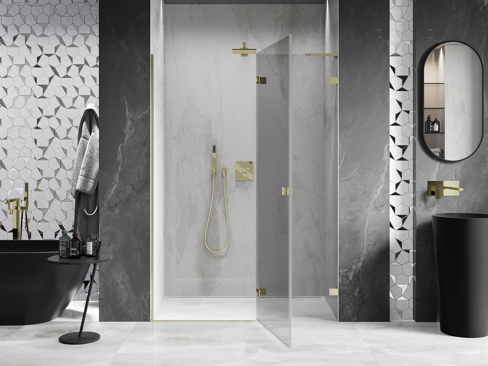 Die Klemmen und Scharniere sind aus sehr haltbarem Messing gefertigt und schließen bündig mit der Glasscheibe ab. Es handelt sich um eine ausgezeichnete Wahl, die Eleganz, Haltbarkeit und modernes Design vereint. Dank solcher Lösungen gewinnen Duschabtrennungen an Ästhetik, während sie gleichzeitig über viele Jahre hinweg eine hohe Funktionalität und Haltbarkeit beibehalten.