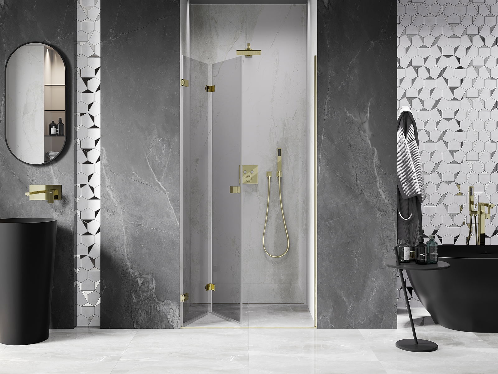 Durch die Möglichkeit, die Tür sowohl außerhalb als auch innen zu falten, können Sie mehr Platz erhalten, wenn Sie die Dusche nicht verwenden. Es ist eine ideale Lösung für kleinere Badezimmer, maximal mit der verfügbaren Oberfläche.
