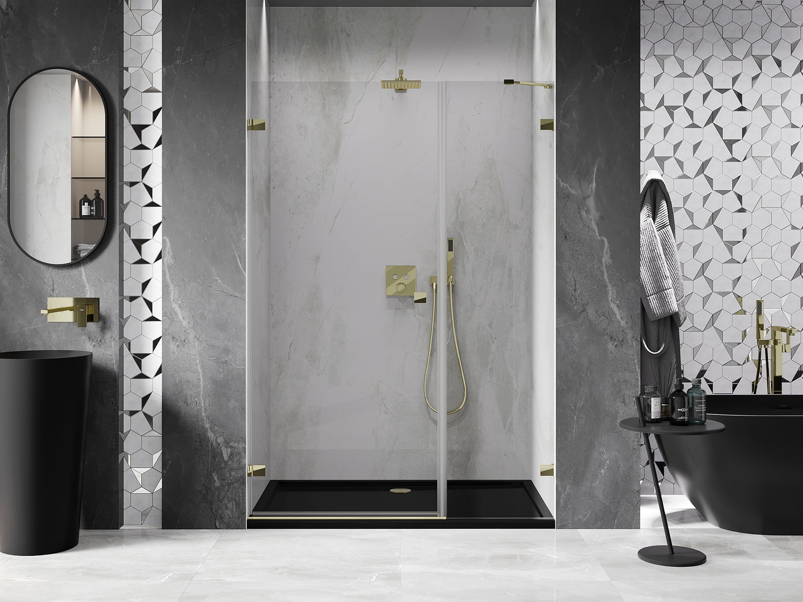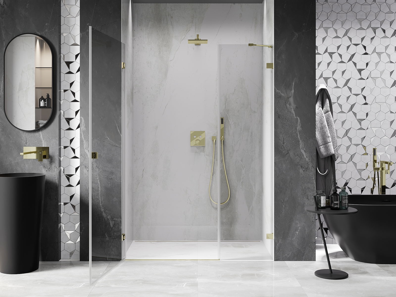 Die Klammern bestehen aus sehr haltbarem Messing und bilden zusätzlich eine flächenbündige Glasscheibe. Dies ist eine ausgezeichnete Wahl, die Eleganz, Haltbarkeit und modernes Design verbindet. Dank solcher Lösungen gewinnt die Dusche an Ästhetik und erleichtert gleichzeitig die Sauberkeit.