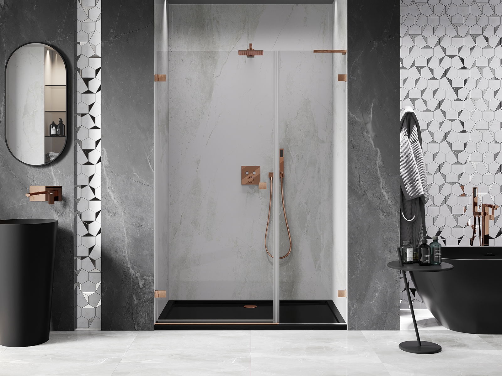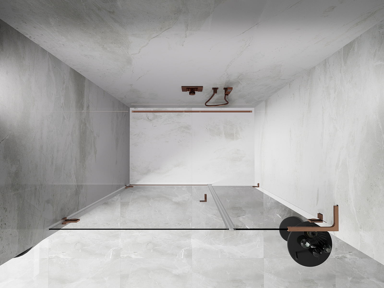 Die Klammern bestehen aus sehr haltbarem Messing und bilden zusätzlich eine flächenbündige Glasscheibe. Dies ist eine ausgezeichnete Wahl, die Eleganz, Haltbarkeit und modernes Design verbindet. Dank solcher Lösungen gewinnt die Dusche an Ästhetik und erleichtert gleichzeitig die Sauberkeit.