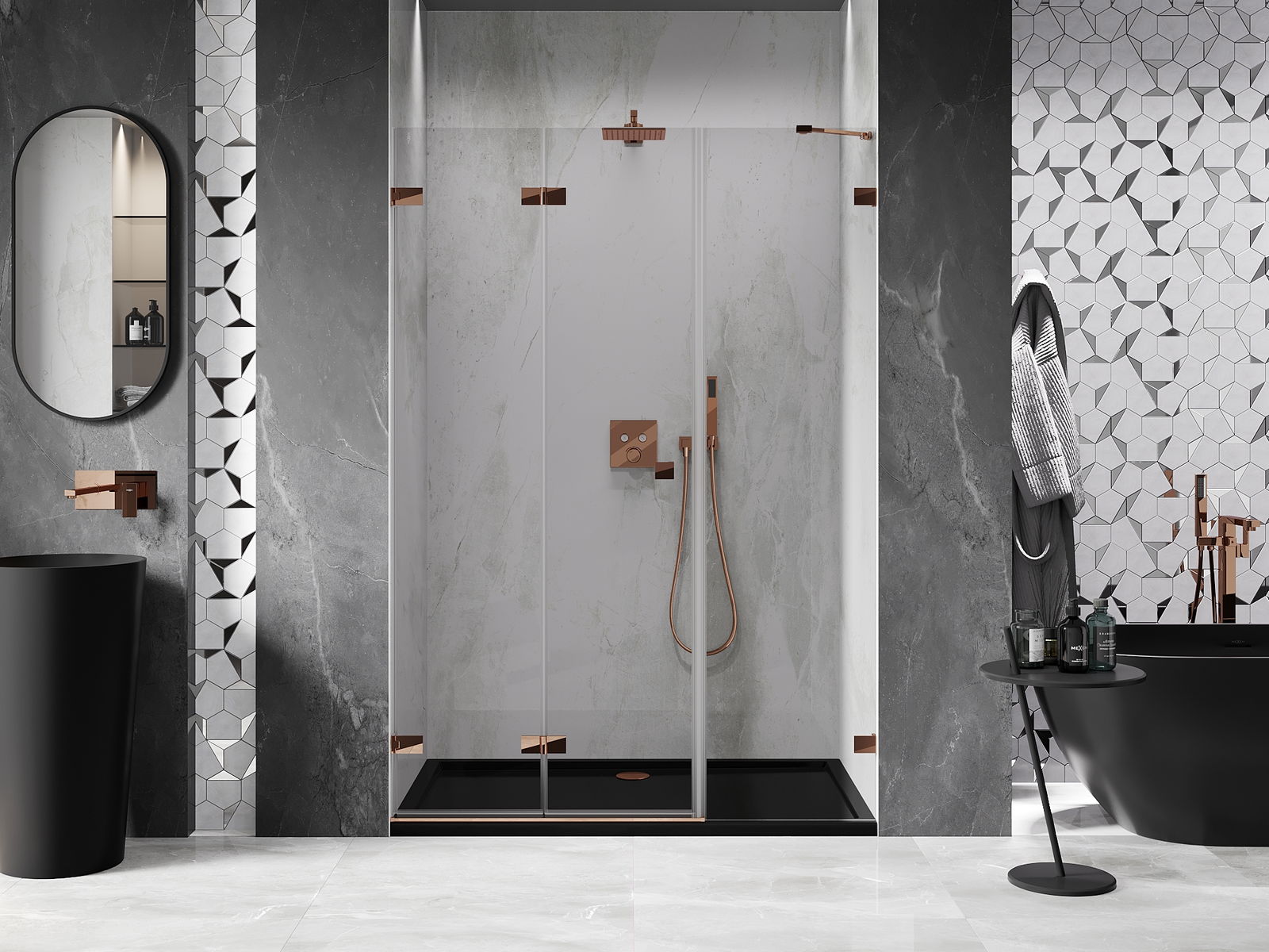 Durch die Möglichkeit, die Tür sowohl außerhalb als auch innen zu falten, können Sie mehr Platz erhalten, wenn Sie die Dusche nicht verwenden. Es ist eine ideale Lösung für kleinere Badezimmer, maximal mit der verfügbaren Oberfläche.