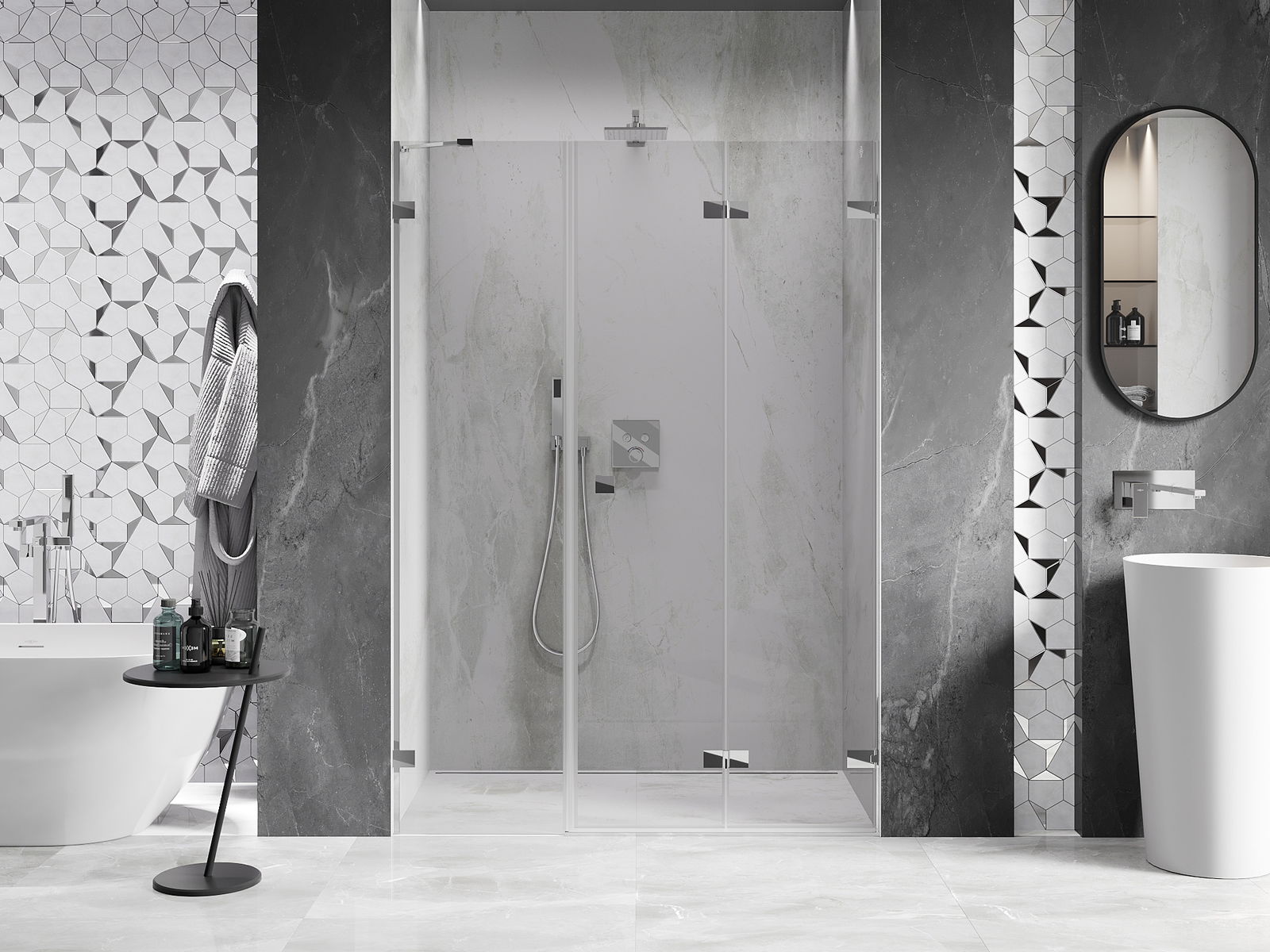Durch die Möglichkeit, die Tür sowohl außerhalb als auch innen zu falten, können Sie mehr Platz erhalten, wenn Sie die Dusche nicht verwenden. Es ist eine ideale Lösung für kleinere Badezimmer, maximal mit der verfügbaren Oberfläche.
