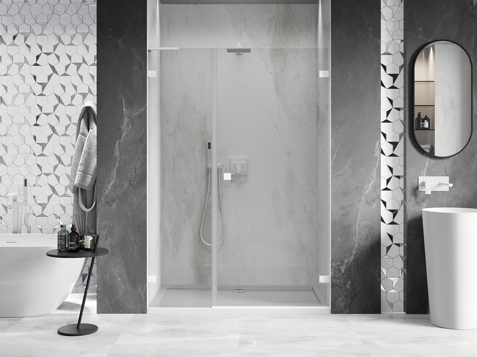 Das Produkt kann je nach Bedarf sowohl auf einer Duschwanne als auch direkt auf dem Boden montiert werden. Die universelle Montagemethode ermöglicht die Anpassung des Produkts an verschiedene Arten von Badezimmern und Raumkonfigurationen.