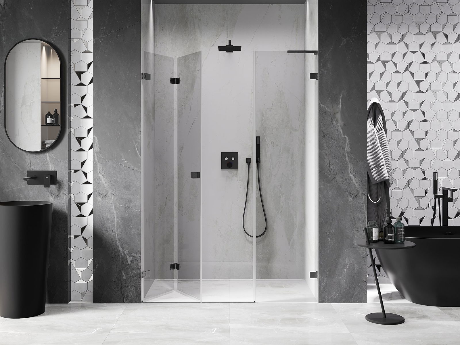 Durch die Möglichkeit, die Tür sowohl außerhalb als auch innen zu falten, können Sie mehr Platz erhalten, wenn Sie die Dusche nicht verwenden. Es ist eine ideale Lösung für kleinere Badezimmer, maximal mit der verfügbaren Oberfläche.