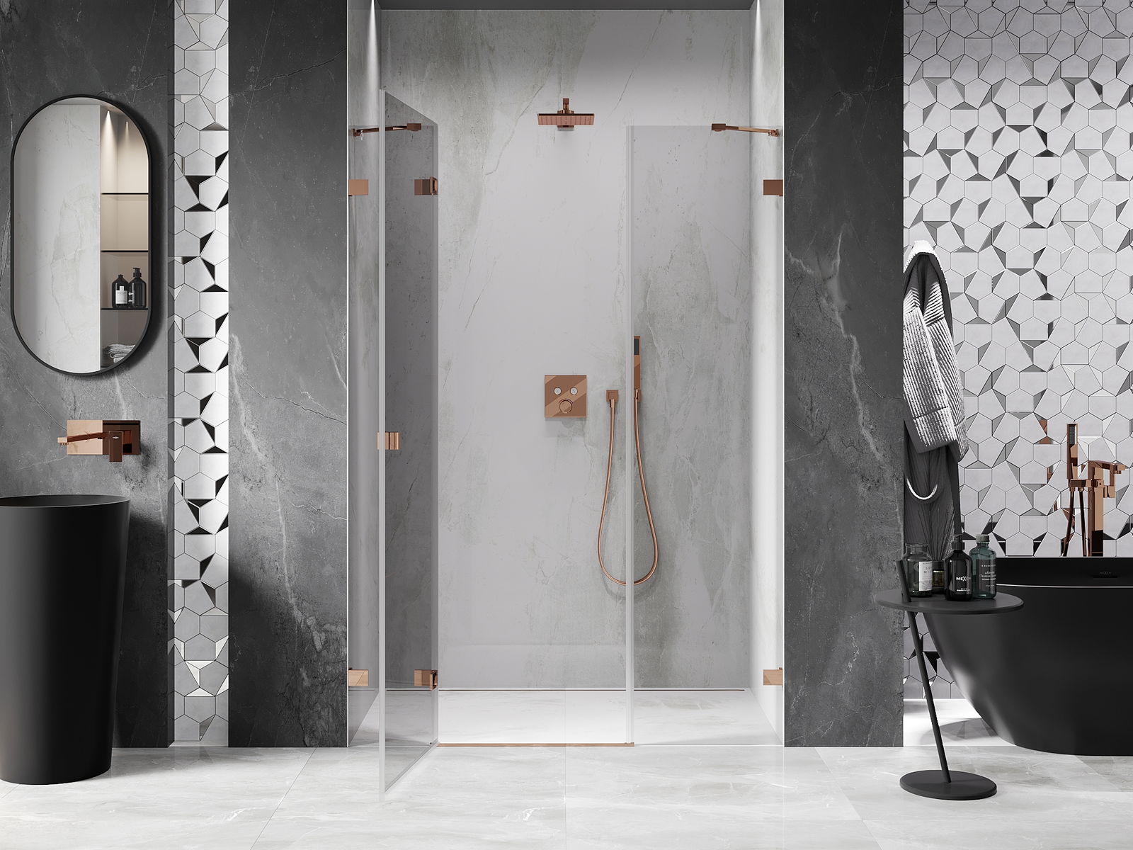 Die Klemmen und Scharniere sind aus sehr haltbarem Messing gefertigt und schließen bündig mit der Glasscheibe ab. Es handelt sich um eine ausgezeichnete Wahl, die Eleganz, Haltbarkeit und modernes Design vereint. Dank solcher Lösungen gewinnen Duschabtrennungen an Ästhetik, während sie gleichzeitig über viele Jahre hinweg eine hohe Funktionalität und Haltbarkeit beibehalten.