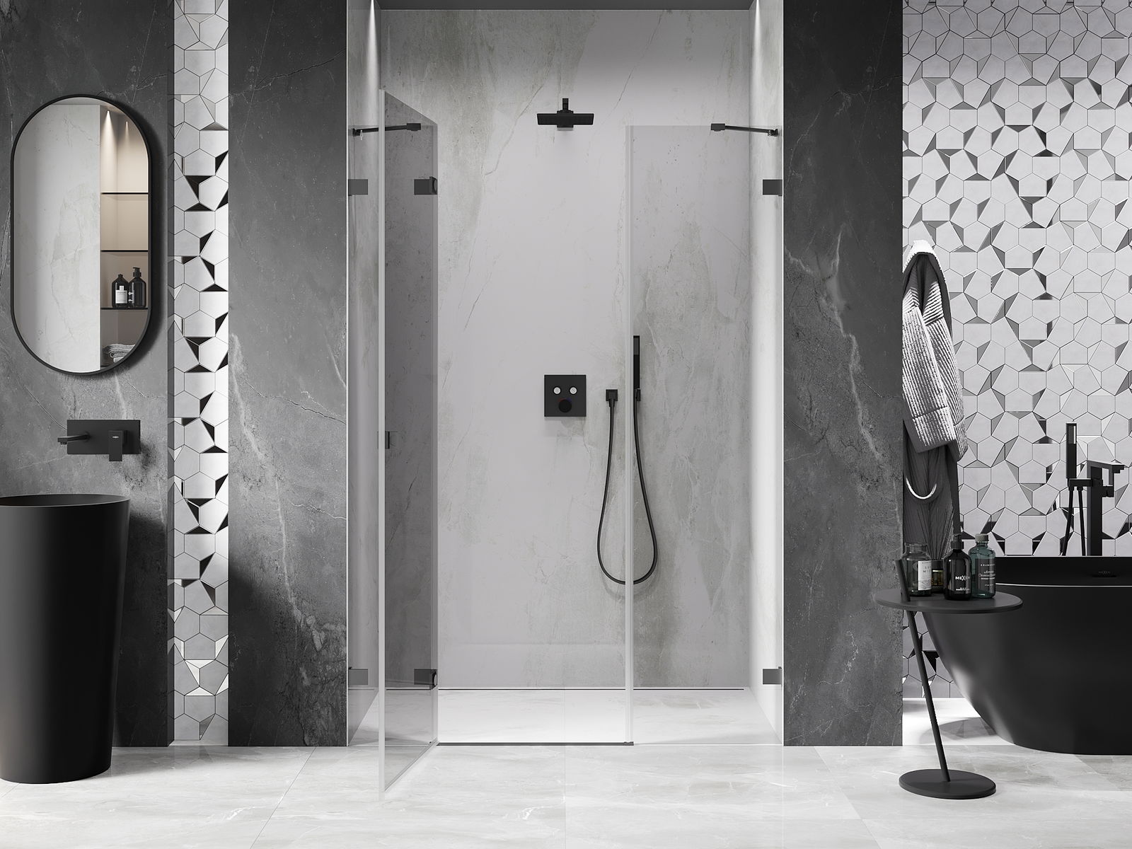 Der praktische und bequeme Griff bestand aus langlebigem und widerstandsfähigem Metall. Die modische Form in Kombination mit einem auf die Farbe der Profile zugeschnittenen Finish verleiht dem Ganzen einen modernen und stilvollen Look und betont die Ästhetik jedes Badezimmers.