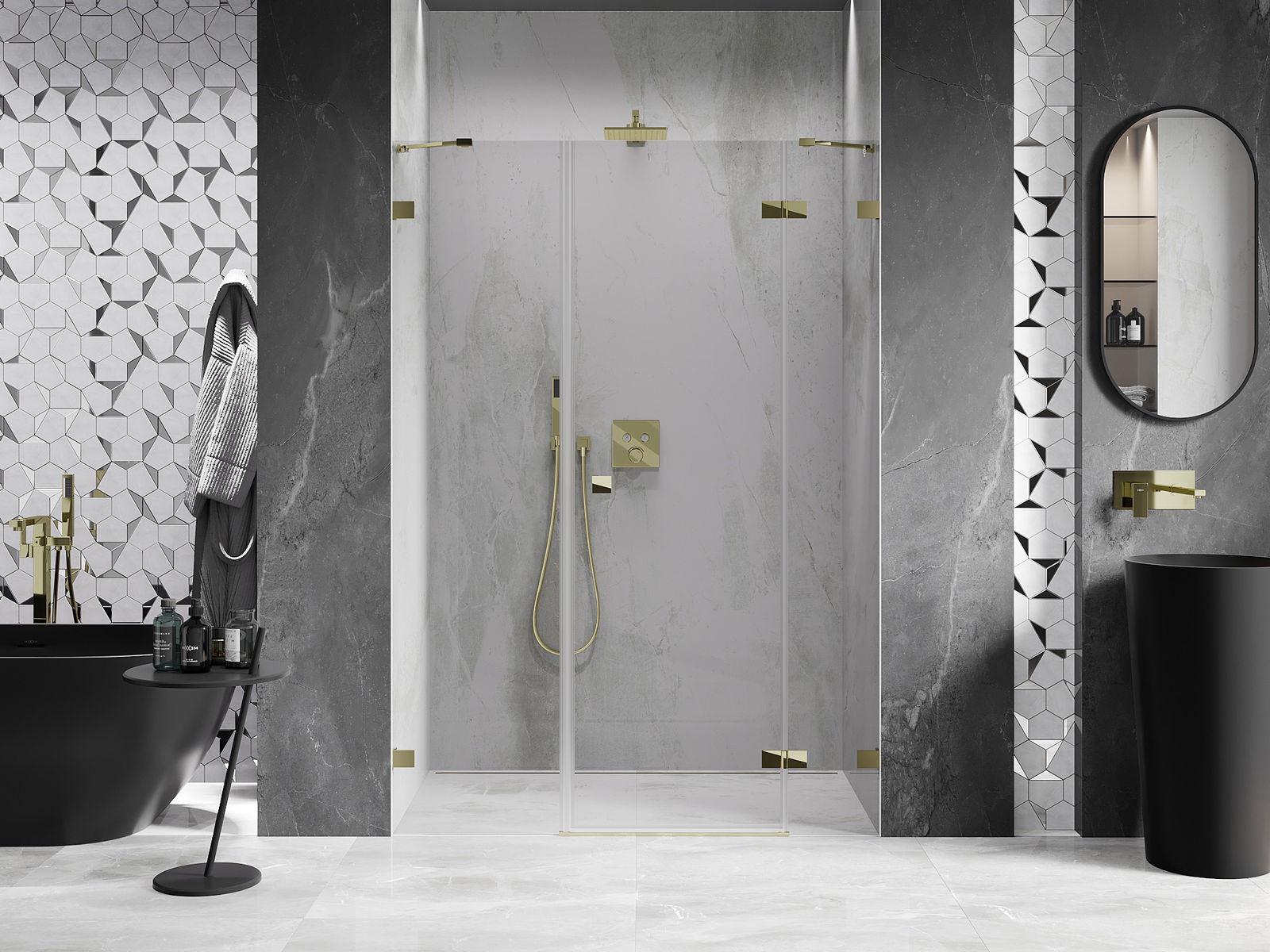 Klammern und Scharniere bestehen aus sehr haltbarem Messing und bilden zudem eine bündige Glasfläche. Dies ist eine ausgezeichnete Wahl, die Eleganz, Haltbarkeit und modernes Design verbindet. Dank solcher Lösungen gewinnt die Dusche an Ästhetik und erleichtert gleichzeitig die Reinigung.