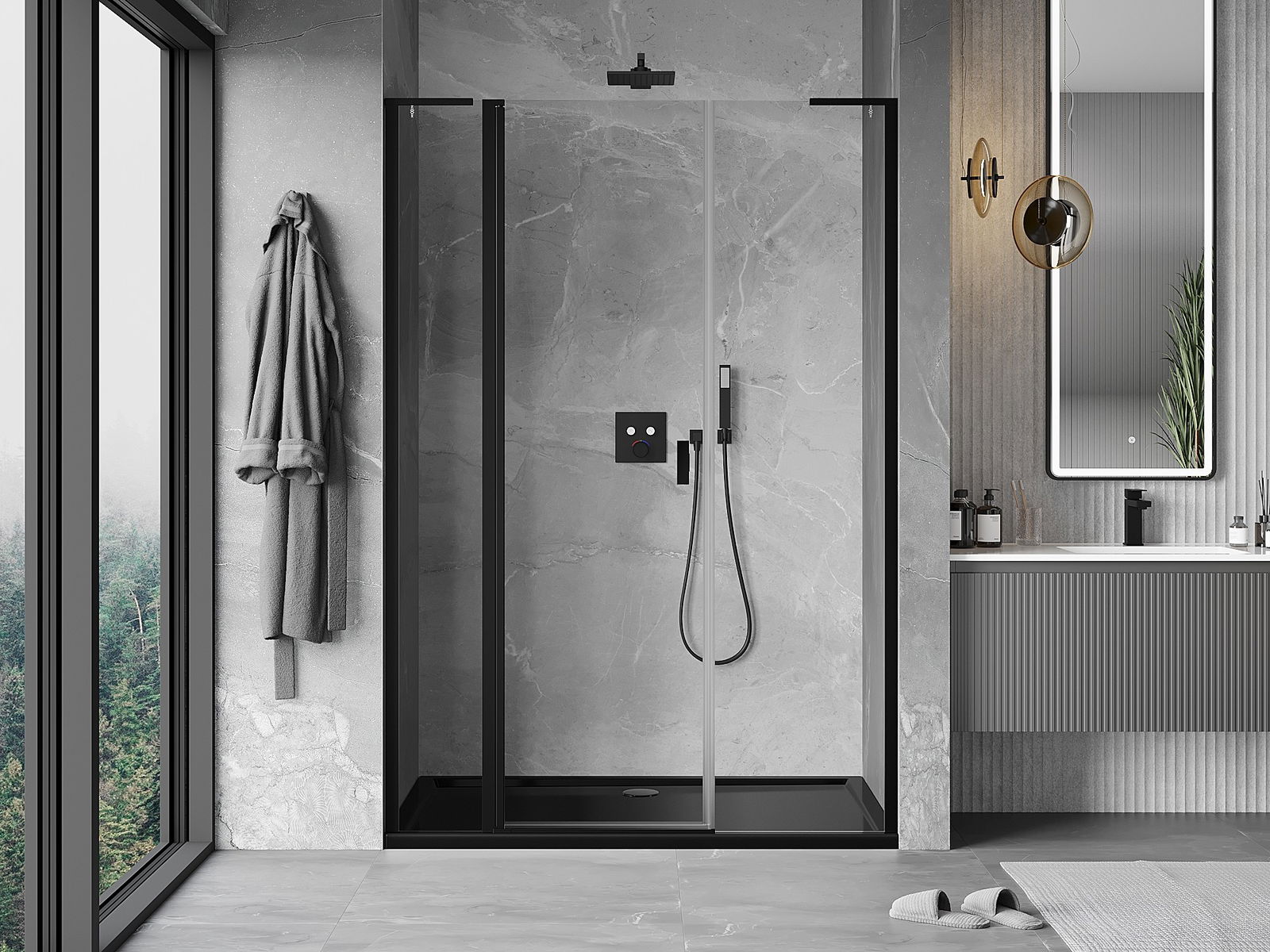 Das Produkt kann je nach Bedarf sowohl auf einer Duschwanne als auch direkt auf dem Boden montiert werden. Die universelle Montagemethode ermöglicht die Anpassung des Produkts an verschiedene Arten von Badezimmern und Raumkonfigurationen.