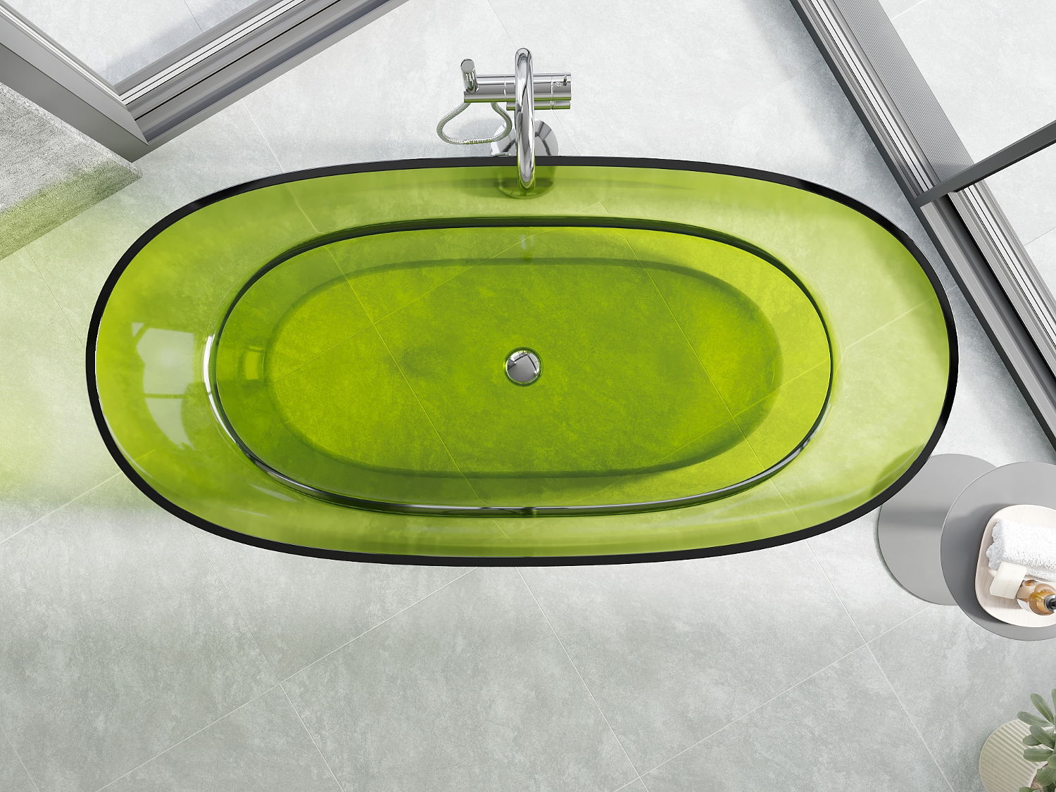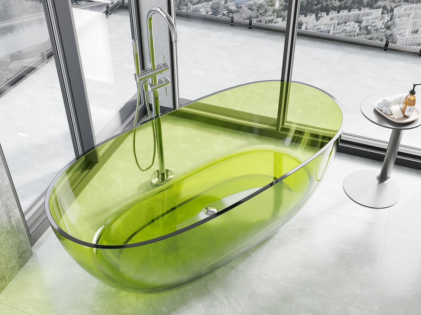 Es ist ein modernes Material, das elegantes Aussehen mit hoher Haltbarkeit verbindet. Es ist widerstandsfähig gegen mechanische Beschädigungen, leicht zu reinigen und angenehm zu berühren. Die transparente Form und der dünne Wannenrand verleihen ihm Leichtigkeit und einen einzigartigen Charakter, wodurch es zu einem eindrucksvollen Akzent in der Badezimmergestaltung wird.