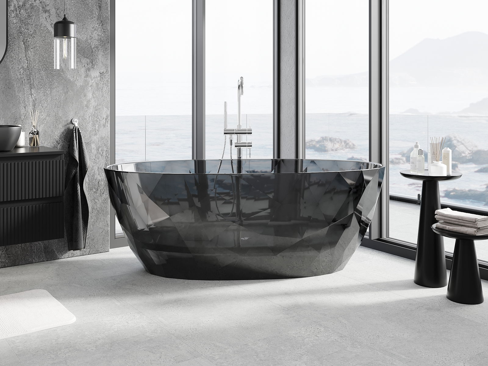 Es ist ein modernes Material, das elegantes Aussehen mit hoher Haltbarkeit verbindet. Es ist widerstandsfähig gegen mechanische Beschädigungen, leicht zu reinigen und angenehm zu berühren. Die transparente Form und der dünne Wannenrand verleihen ihm Leichtigkeit und einen einzigartigen Charakter, wodurch es zu einem eindrucksvollen Akzent in der Badezimmergestaltung wird.