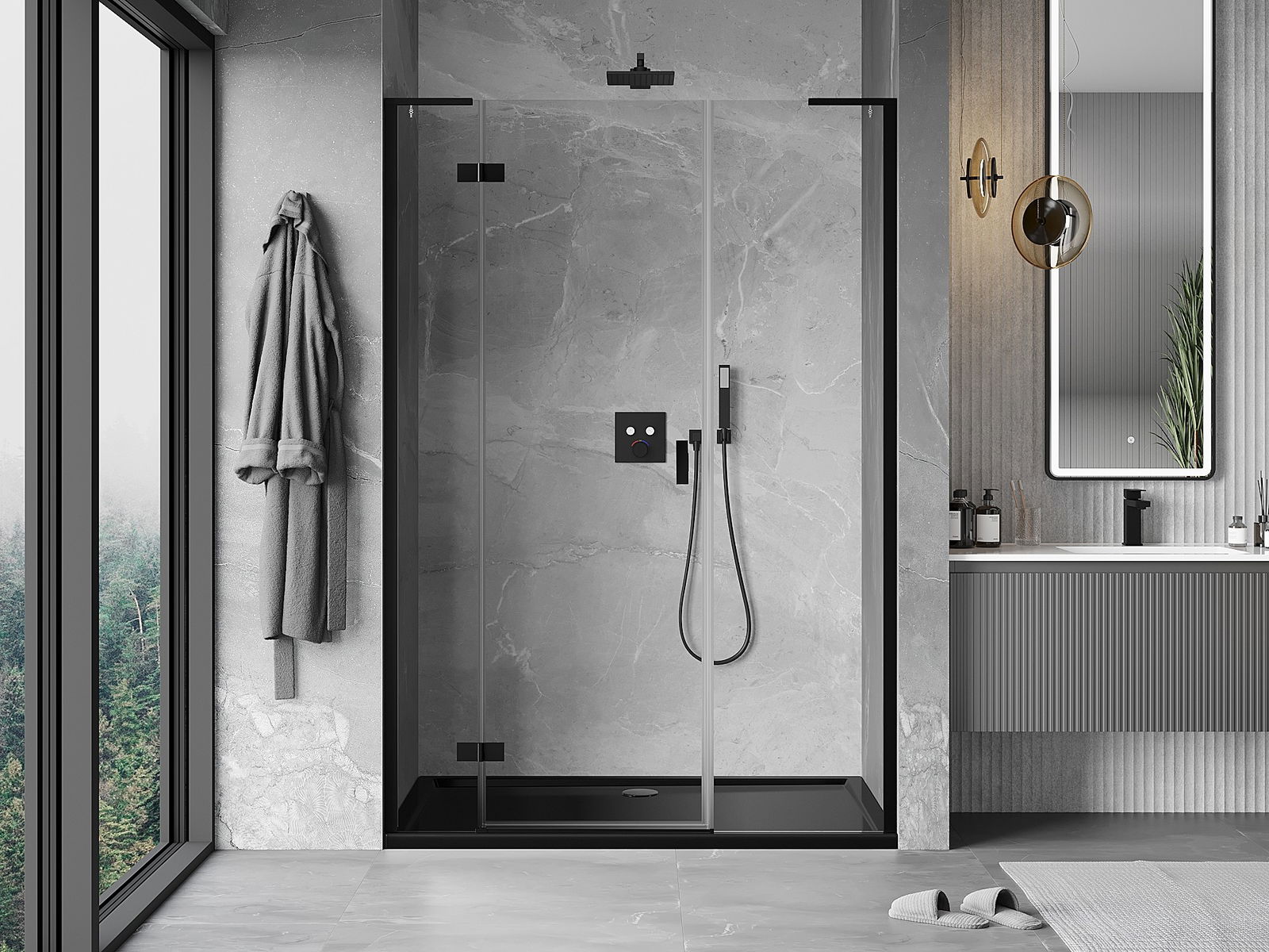 Das Produkt kann je nach Bedarf sowohl auf einer Duschwanne als auch direkt auf dem Boden montiert werden. Die universelle Montagemethode ermöglicht die Anpassung des Produkts an verschiedene Arten von Badezimmern und Raumkonfigurationen.