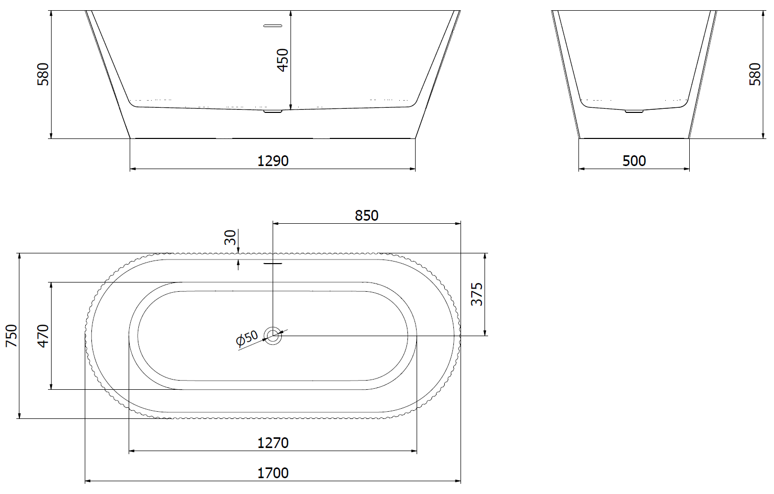 Mexen Yara freistehende geriffelte Badewanne 170 x 75 cm, weiß, schwarzer Überlauf - 52861707500-70