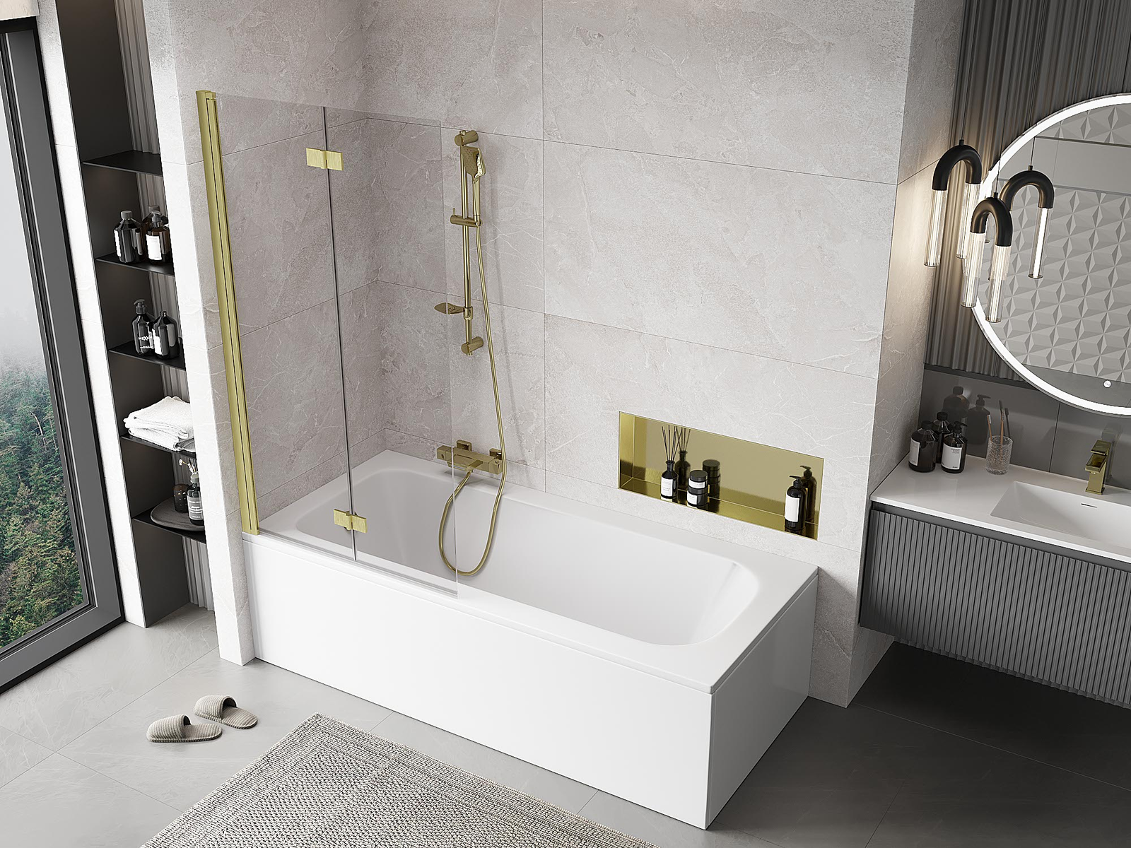 Eine Paravent, bestehend aus zwei Flügeln, die zusammengefaltet werden können. Eine solche Lösung spart Platz im Badezimmer und ermöglicht eine freie Nutzung des verbleibenden Raums, wenn der Badebereich nicht genutzt wird.