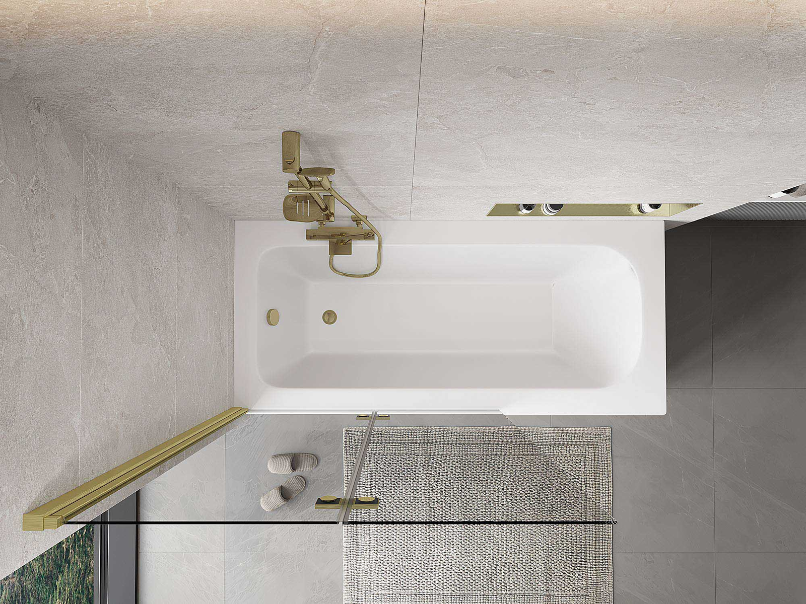 Eine Paravent, bestehend aus zwei Flügeln, die zusammengefaltet werden können. Eine solche Lösung spart Platz im Badezimmer und ermöglicht eine freie Nutzung des verbleibenden Raums, wenn der Badebereich nicht genutzt wird.