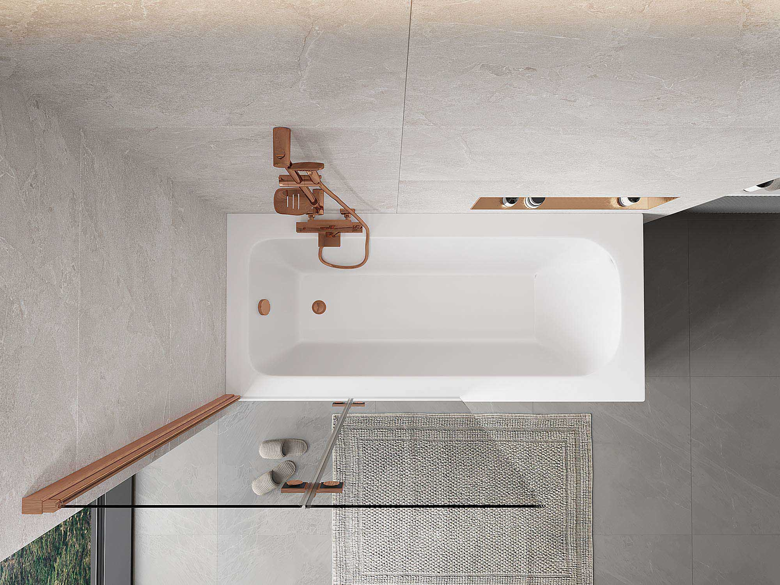 Eine Paravent, bestehend aus zwei Flügeln, die zusammengefaltet werden können. Eine solche Lösung spart Platz im Badezimmer und ermöglicht eine freie Nutzung des verbleibenden Raums, wenn der Badebereich nicht genutzt wird.
