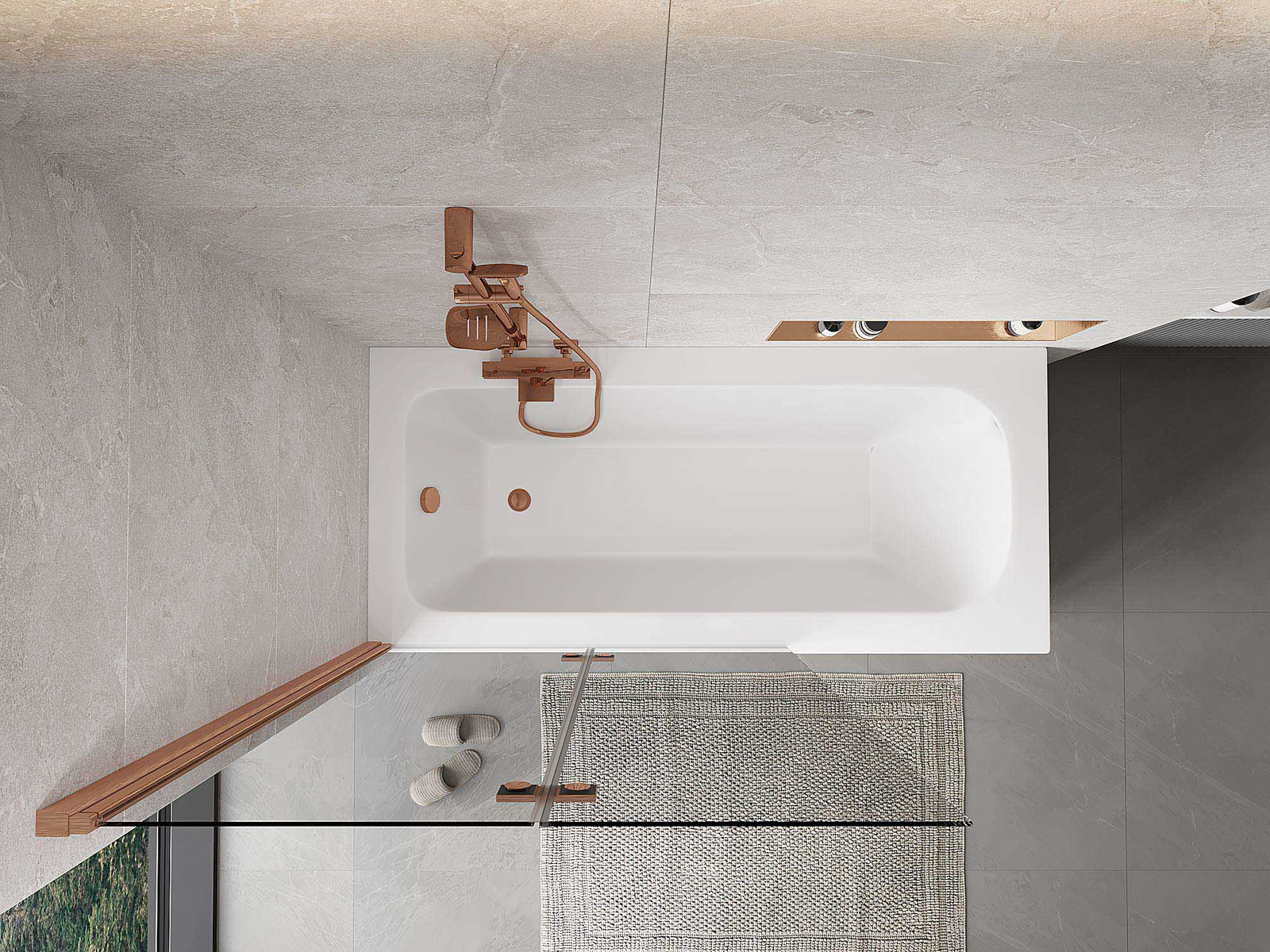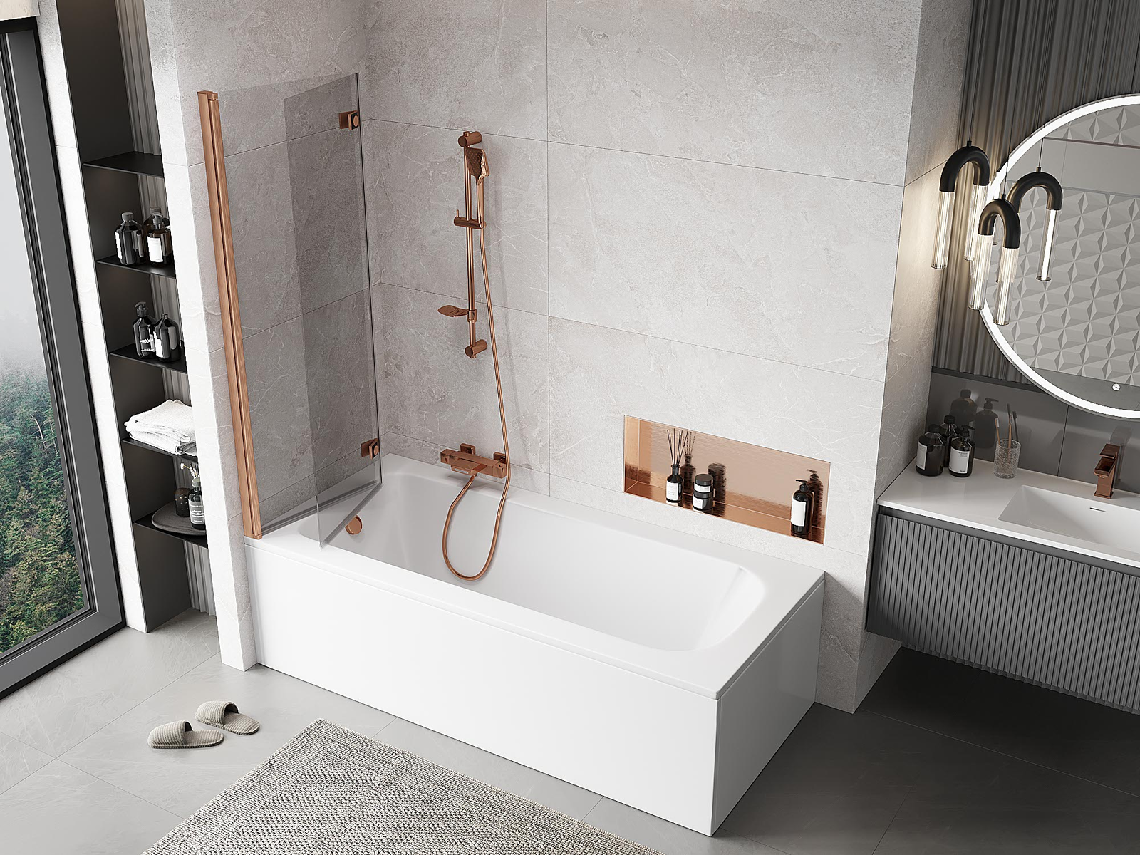 Eine Paravent, bestehend aus zwei Flügeln, die zusammengefaltet werden können. Eine solche Lösung spart Platz im Badezimmer und ermöglicht eine freie Nutzung des verbleibenden Raums, wenn der Badebereich nicht genutzt wird.