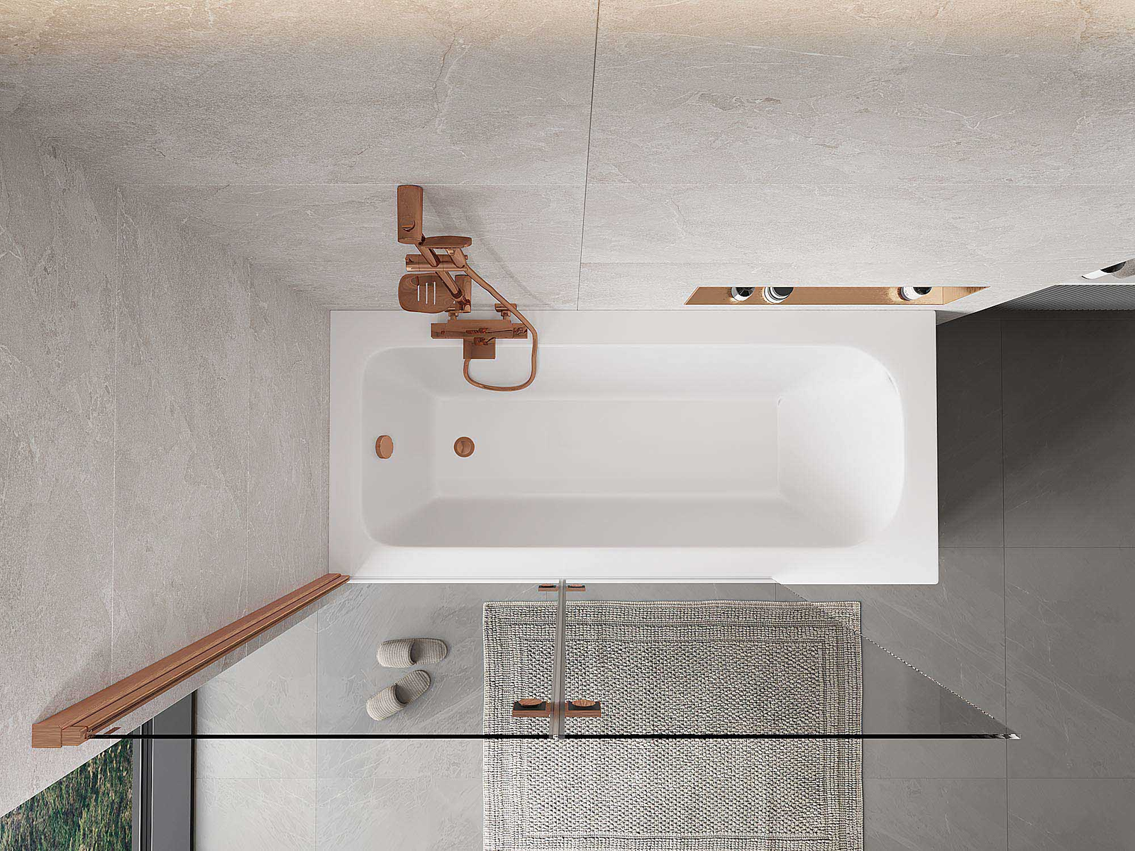 Eine Paravent, bestehend aus zwei Flügeln, die zusammengefaltet werden können. Eine solche Lösung spart Platz im Badezimmer und ermöglicht eine freie Nutzung des verbleibenden Raums, wenn der Badebereich nicht genutzt wird.