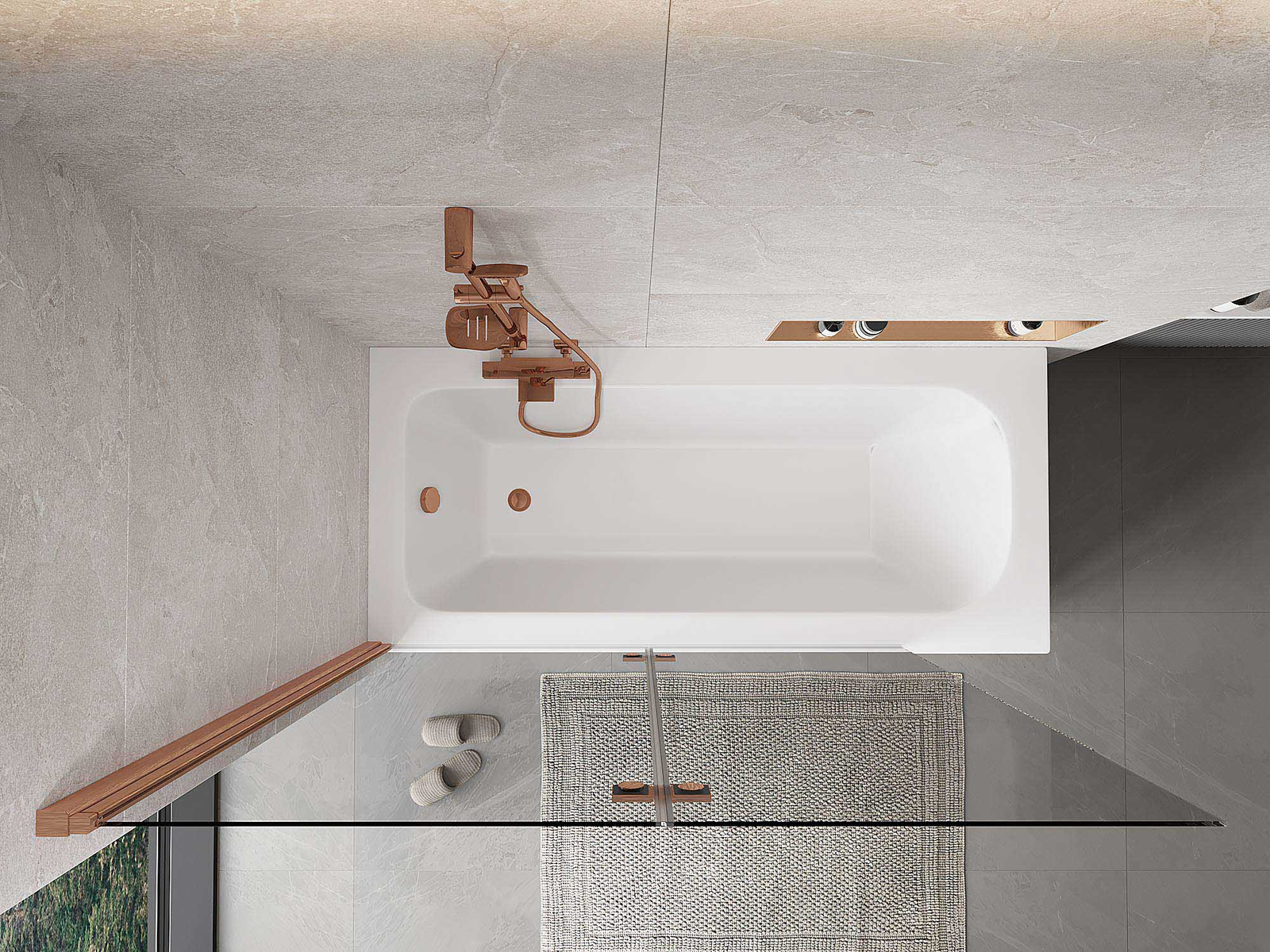 Eine Paravent, bestehend aus zwei Flügeln, die zusammengefaltet werden können. Eine solche Lösung spart Platz im Badezimmer und ermöglicht eine freie Nutzung des verbleibenden Raums, wenn der Badebereich nicht genutzt wird.