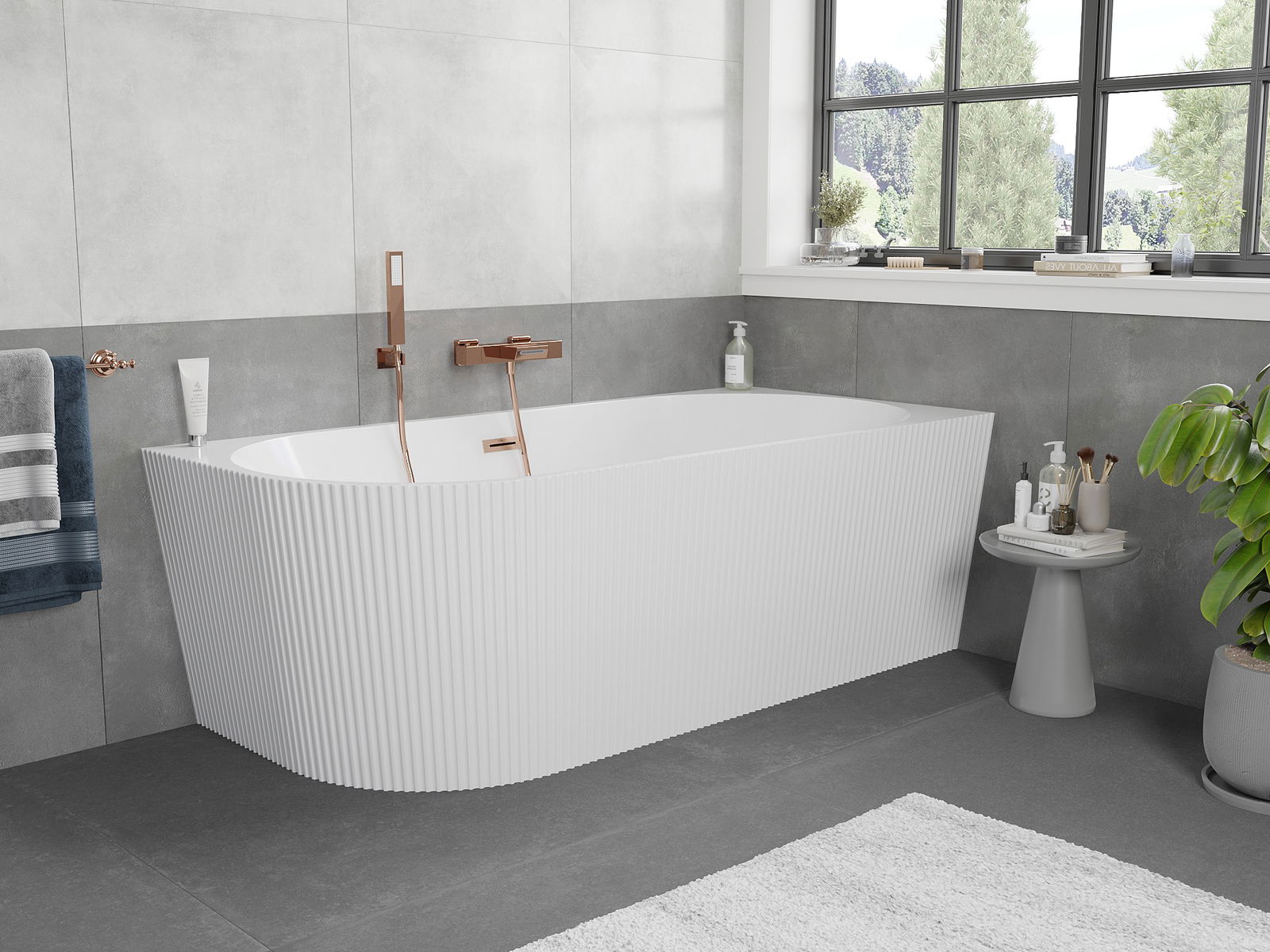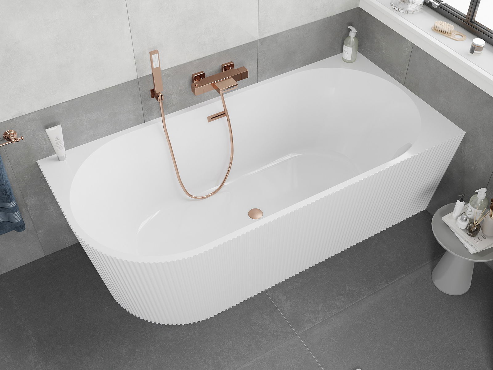 Mexen Silo freistehende Eckbadewanne rechts geriffelt 150 x 75 cm, weiß, Überlauf gebürstetes Kupfer - 52891507500P-65