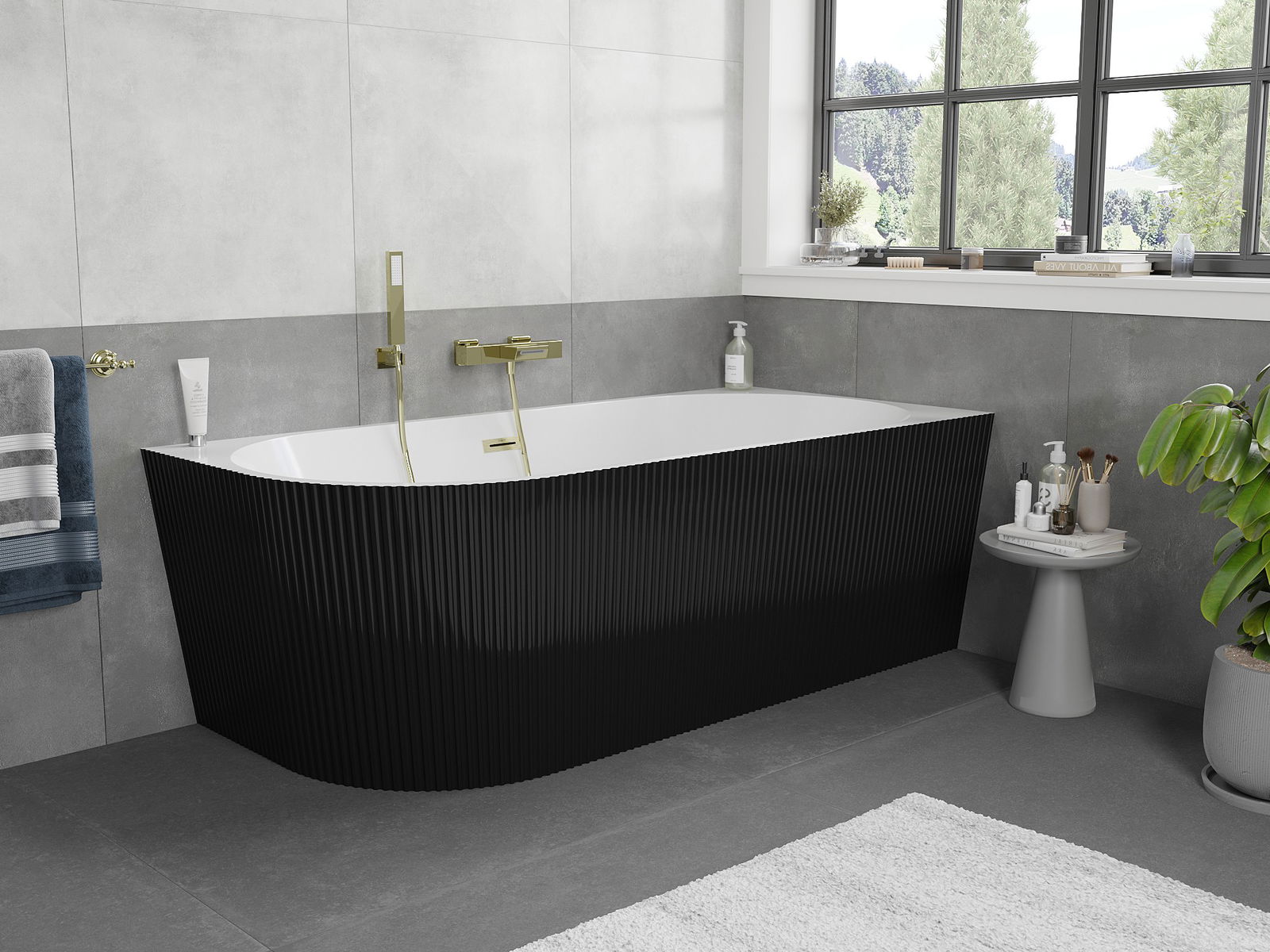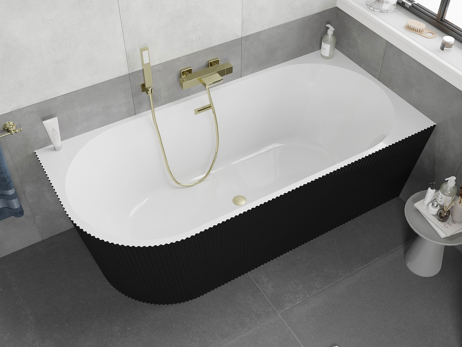Mexen Silo freistehende Eckbadewanne rechts geriffelt 150 x 75 cm, weiß/schwarz, Überlauf gold gebürstet - 52891507575P-55