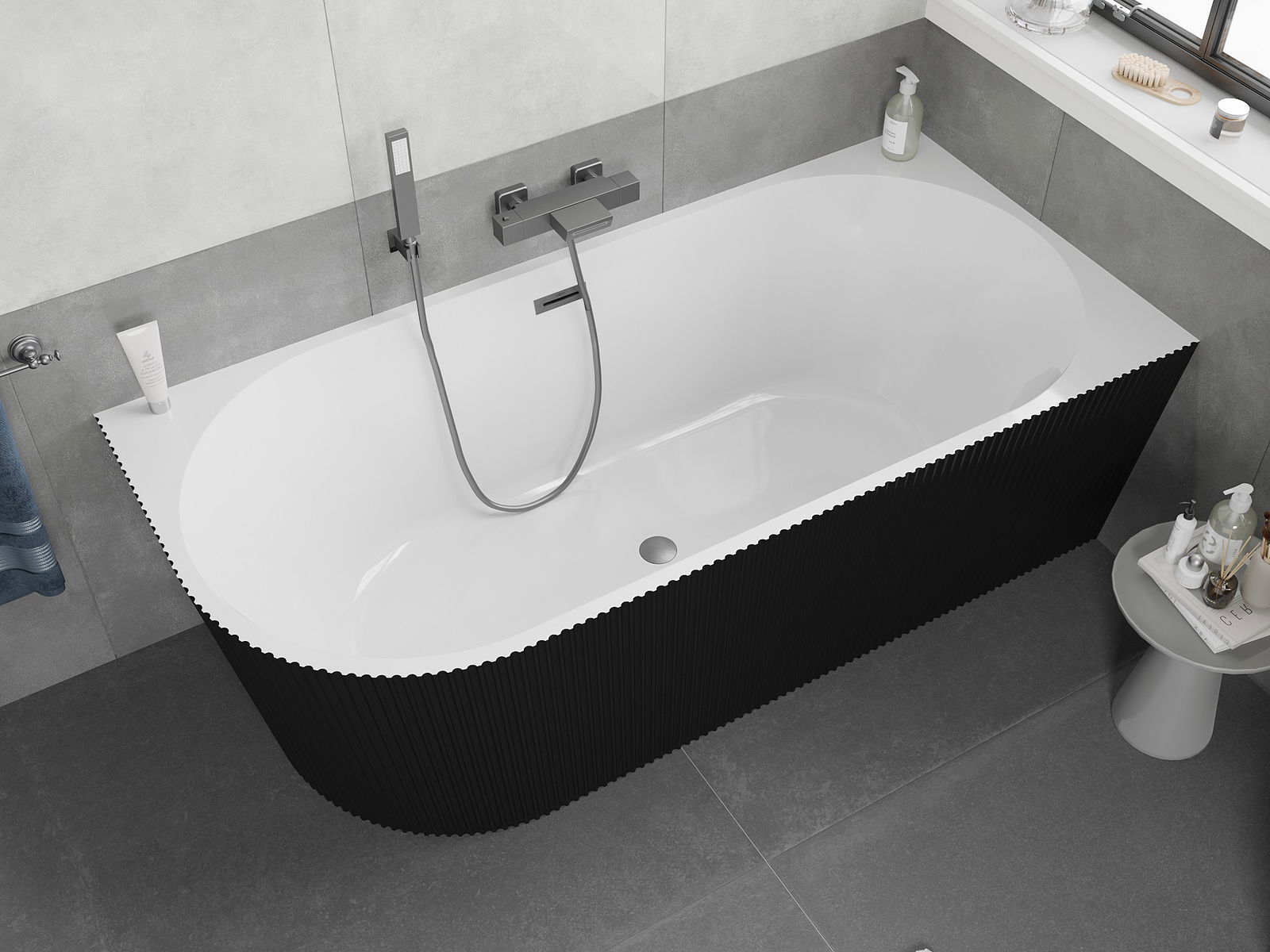 Mexen Silo freistehende Eckbadewanne rechts geriffelt 150 x 75 cm, weiß/schwarz, Überlauf gun gray gebürstet