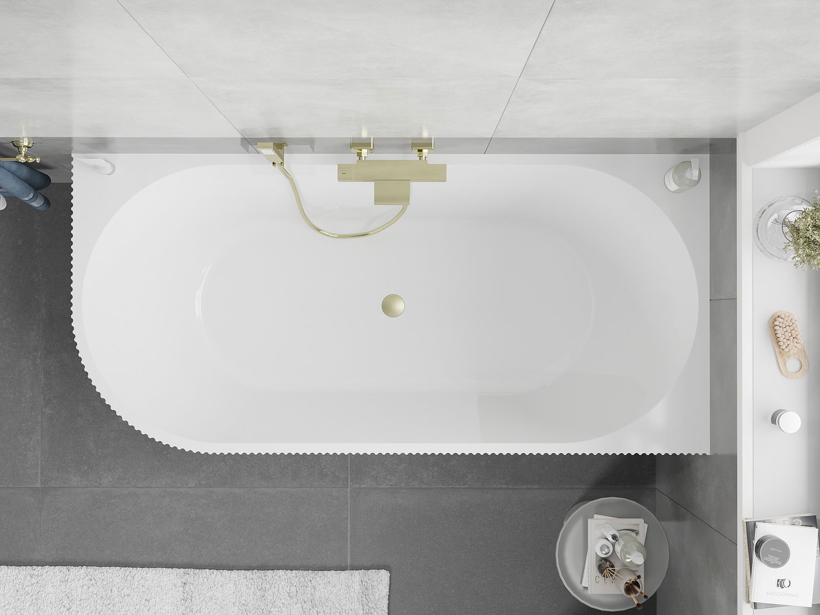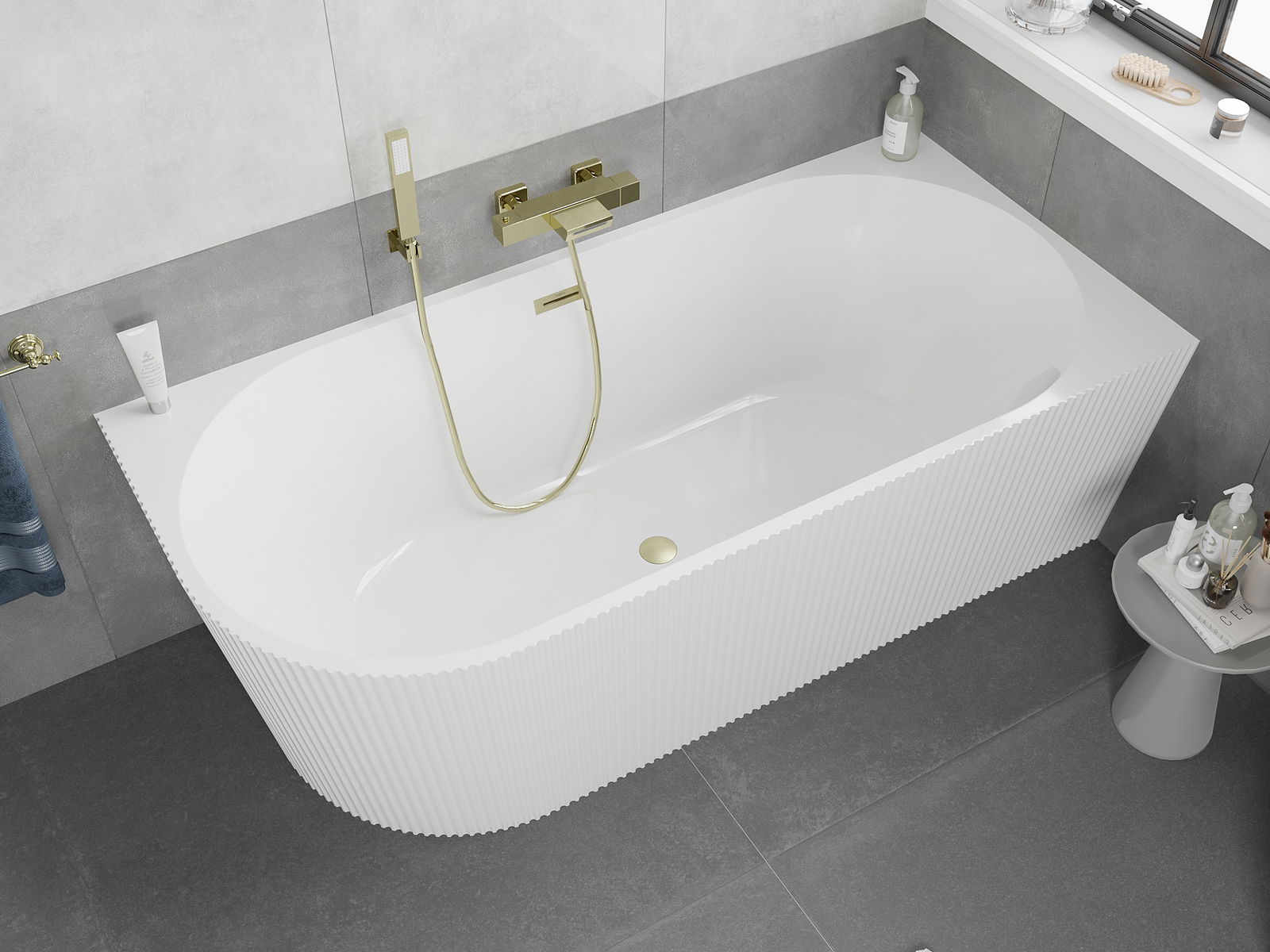 Mexen Silo freistehende Eckbadewanne rechts geriffelt 170 x 80 cm, weiß, Überlauf gebürstet gold - 52891708000P-55