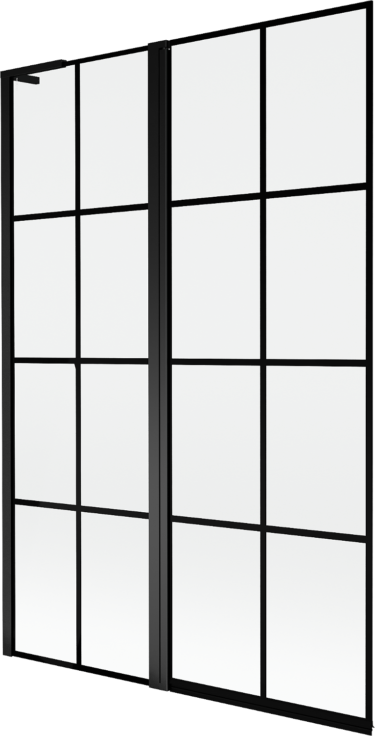 Eine Paravent, bestehend aus zwei Flügeln, die zusammengefaltet werden können. Eine solche Lösung spart Platz im Badezimmer und ermöglicht eine freie Nutzung des verbleibenden Raums, wenn der Badebereich nicht genutzt wird.