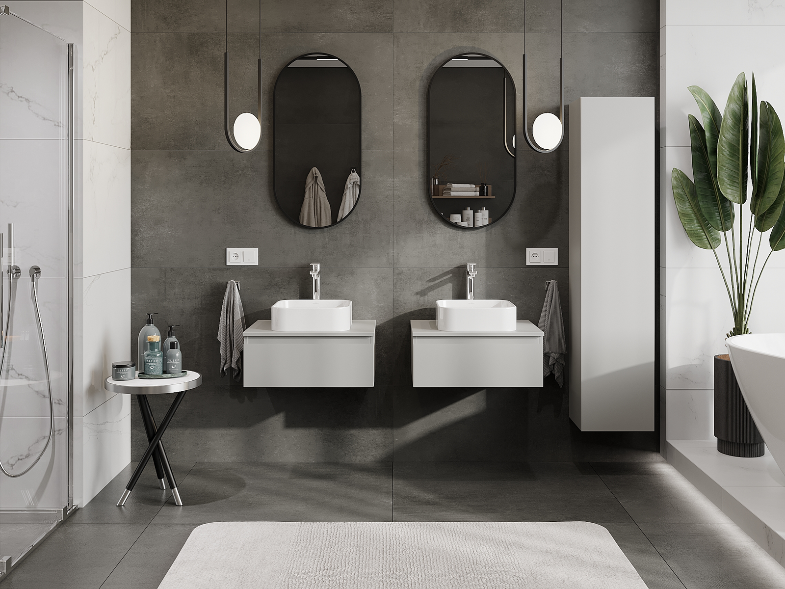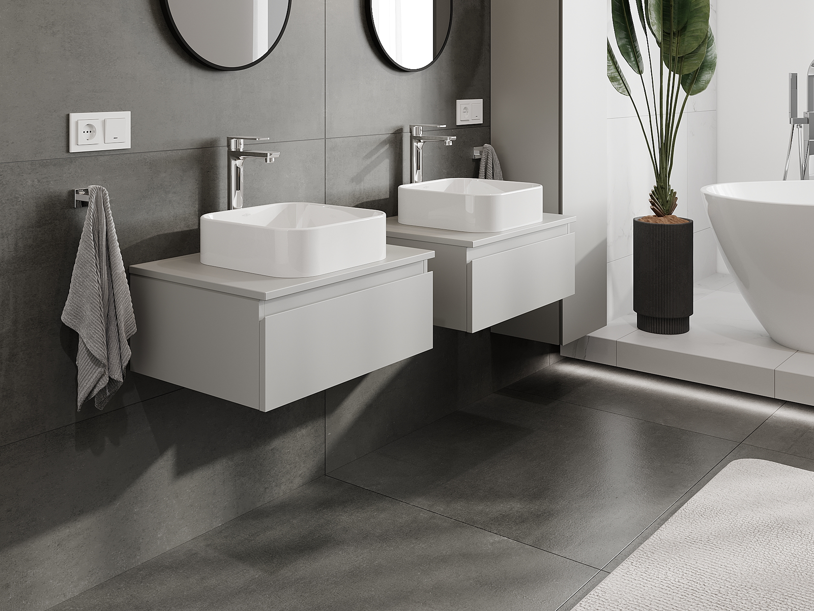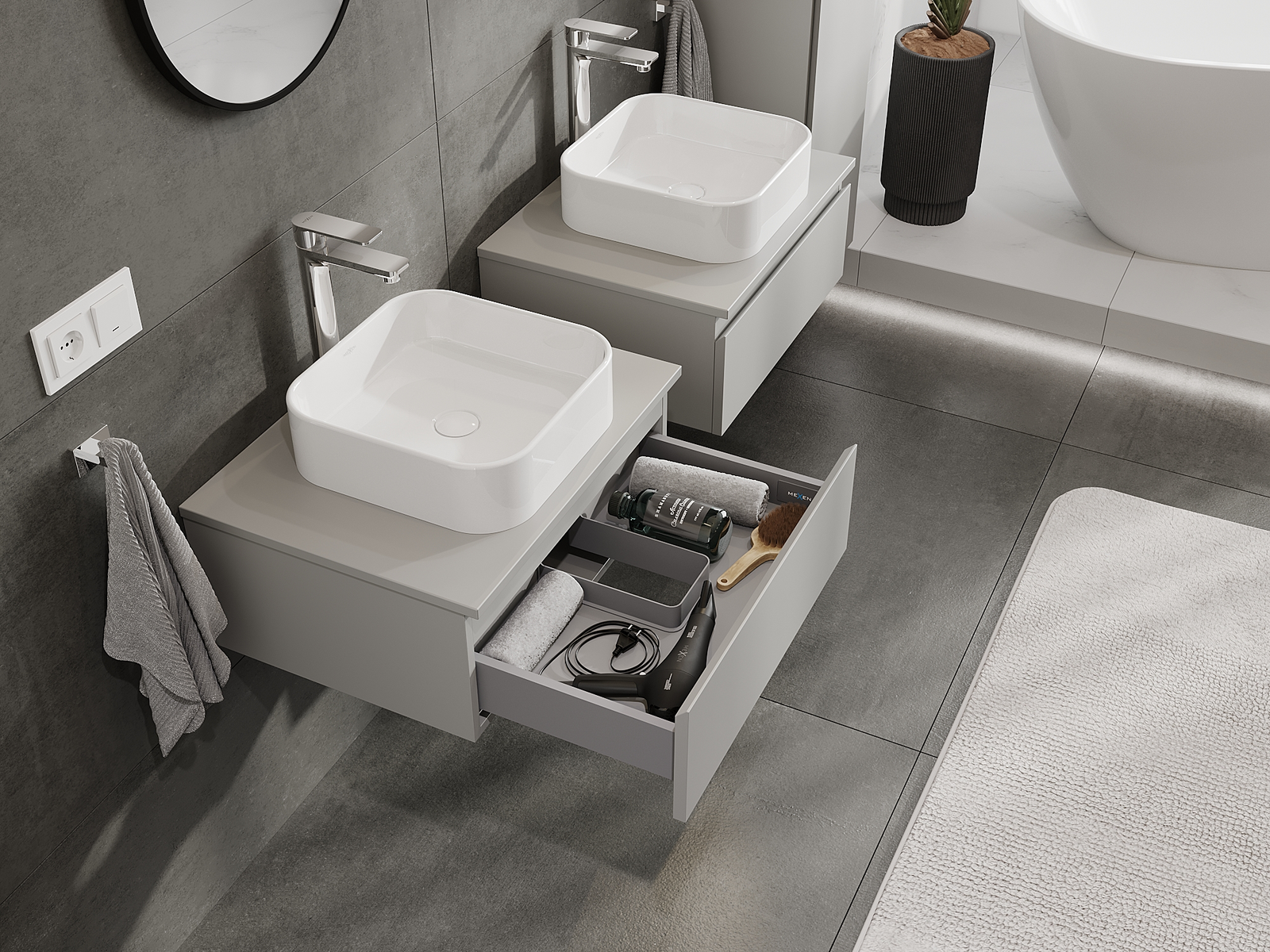 Unsere modularen Badezimmermöbel können in verschiedenen Farbkonfigurationen miteinander kombiniert werden, wodurch eine vollständige Personalisierung ermöglicht wird. Man kann sowohl das Aussehen als auch die Funktionen der einzelnen Elemente auswählen, was es erlaubt, die Möbel an eigene stilistische und funktionale Vorlieben anzupassen.