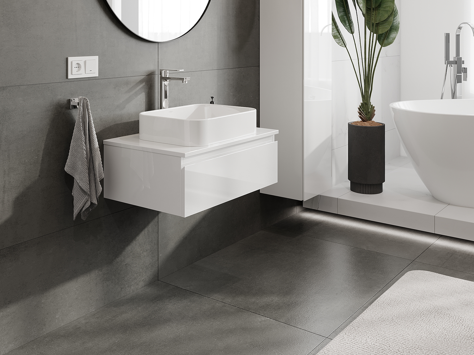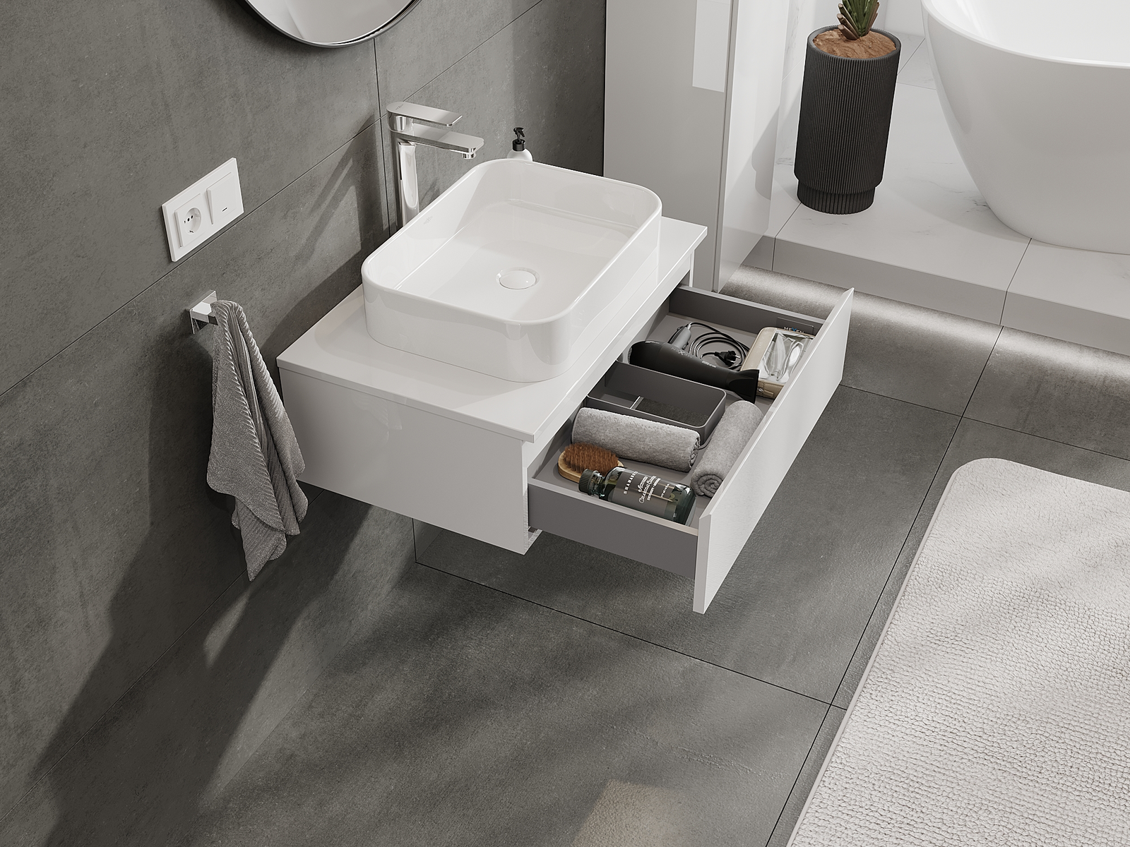 Unsere modularen Badezimmermöbel können in verschiedenen Farbkonfigurationen miteinander kombiniert werden, wodurch eine vollständige Personalisierung ermöglicht wird. Man kann sowohl das Aussehen als auch die Funktionen der einzelnen Elemente auswählen, was es erlaubt, die Möbel an eigene stilistische und funktionale Vorlieben anzupassen.