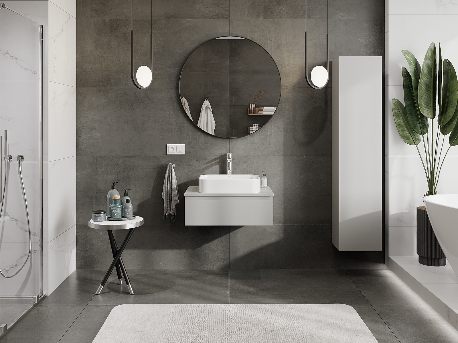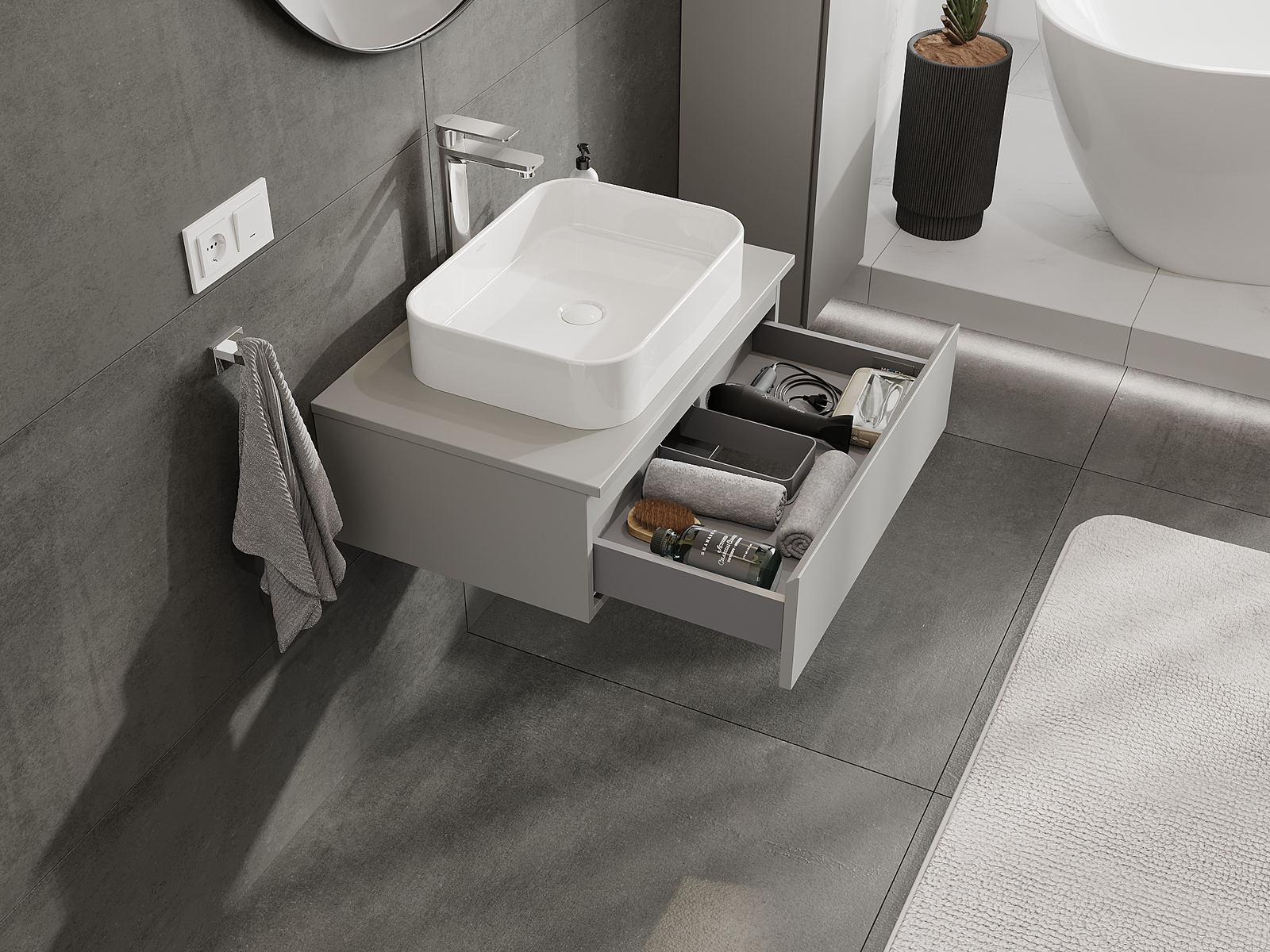 Unsere modularen Badezimmermöbel können in verschiedenen Farbkonfigurationen miteinander kombiniert werden, wodurch eine vollständige Personalisierung ermöglicht wird. Man kann sowohl das Aussehen als auch die Funktionen der einzelnen Elemente auswählen, was es erlaubt, die Möbel an eigene stilistische und funktionale Vorlieben anzupassen.