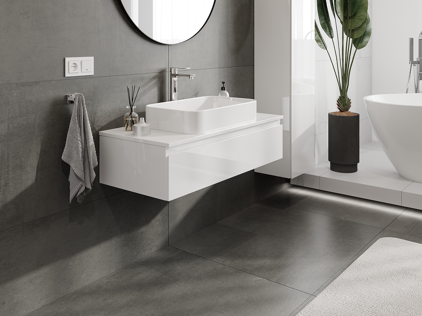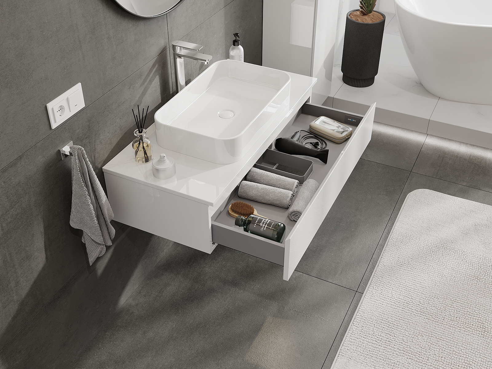 Unsere modularen Badezimmermöbel können in verschiedenen Farbkonfigurationen miteinander kombiniert werden, wodurch eine vollständige Personalisierung ermöglicht wird. Man kann sowohl das Aussehen als auch die Funktionen der einzelnen Elemente auswählen, was es erlaubt, die Möbel an eigene stilistische und funktionale Vorlieben anzupassen.