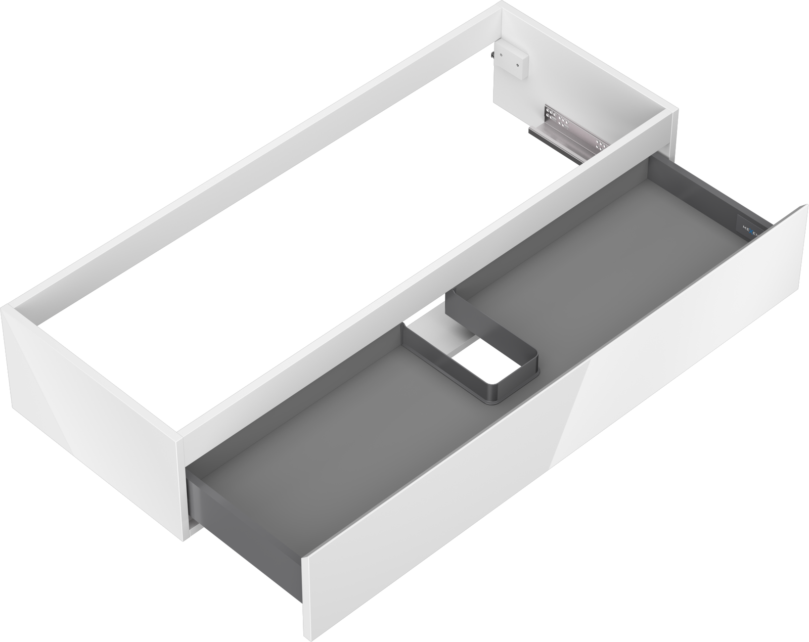 Der Ausschnitt in der Schublade ist so gestaltet, dass er den Siphon aufnehmen kann, der für Waschbeckeninstallationen erforderlich ist. Dadurch kann das Möbelstück voll funktionsfähig montiert werden, ohne auf den Platz in der Schublade zugunsten der Installation verzichten zu müssen.