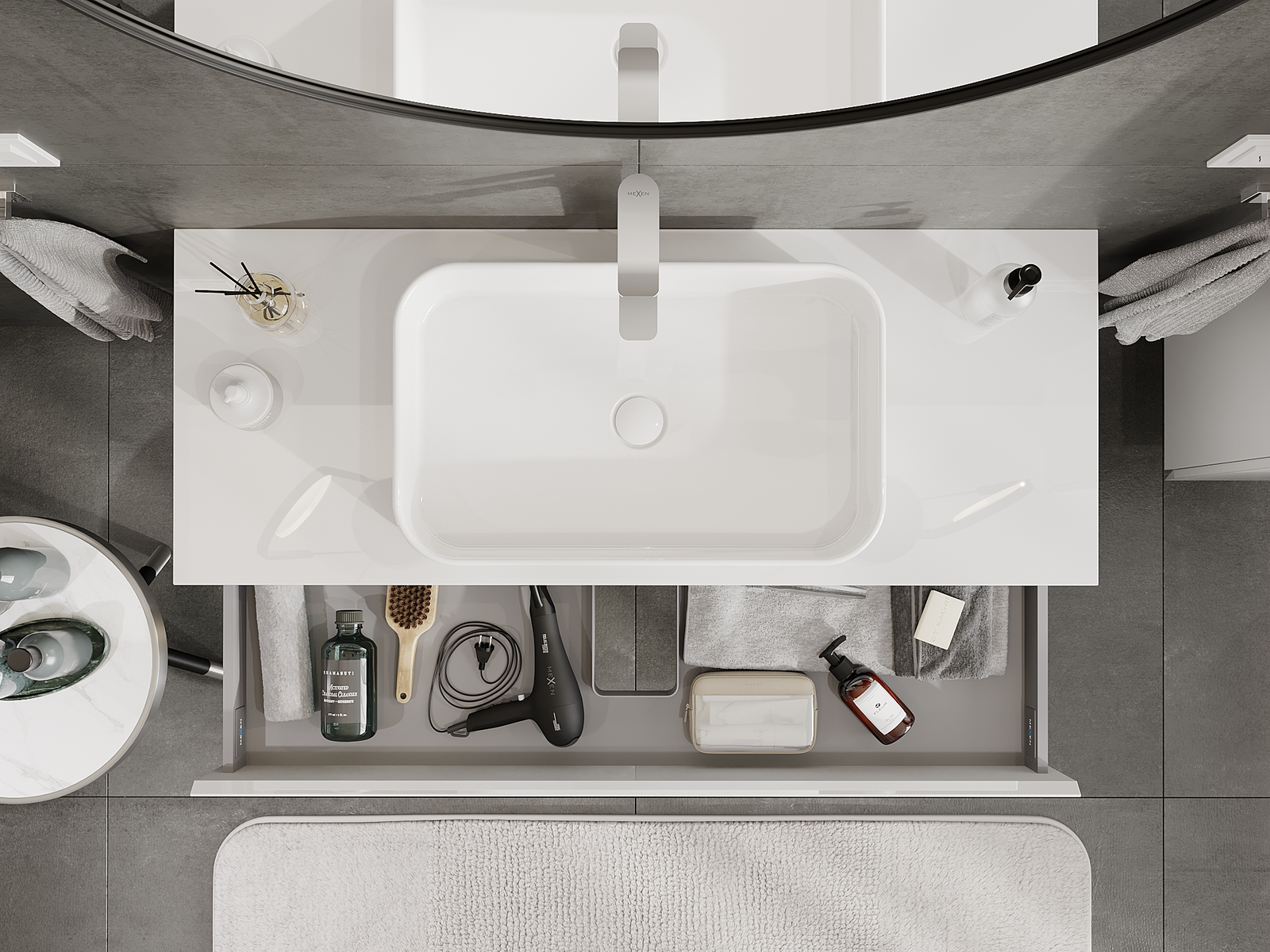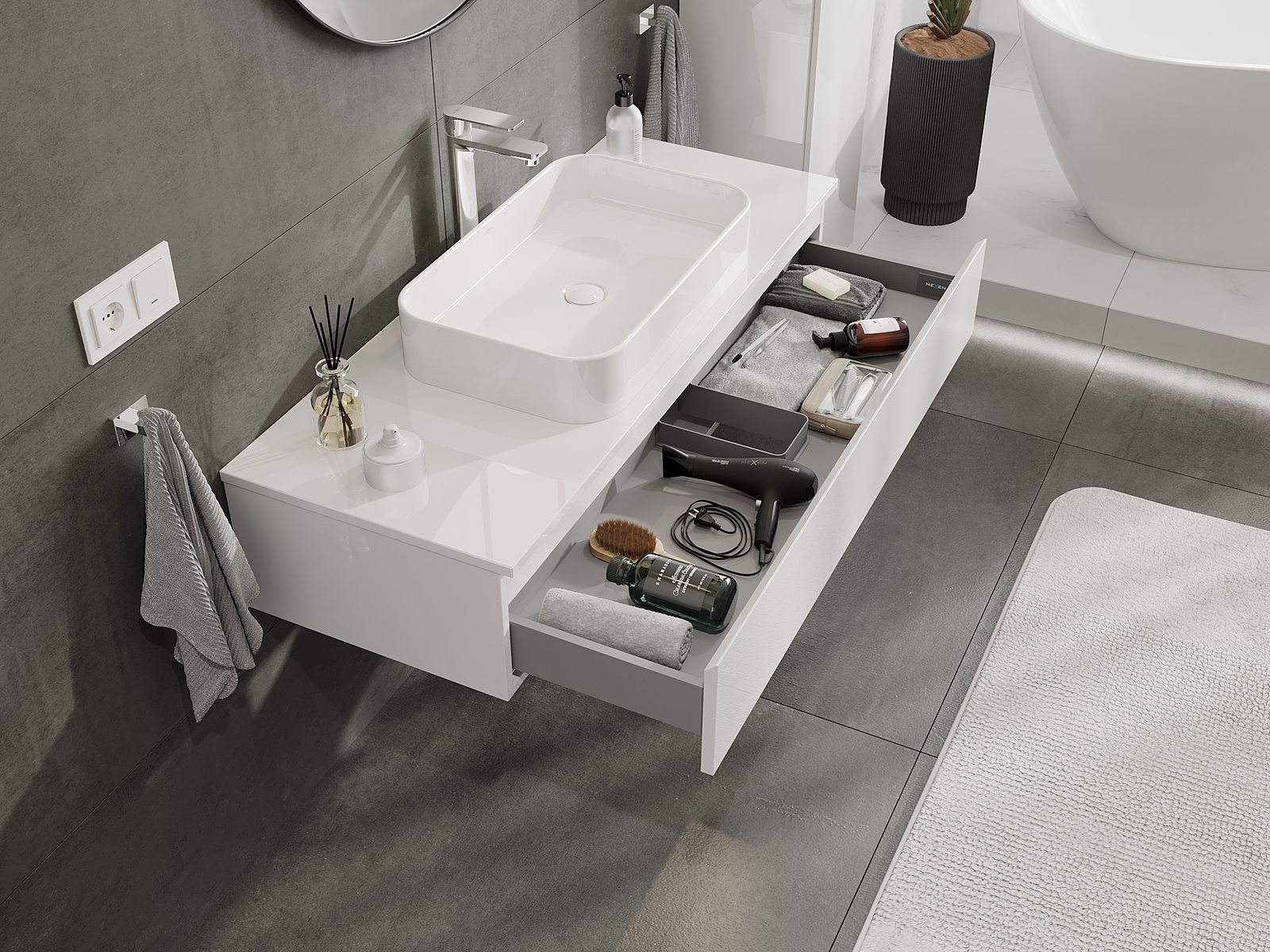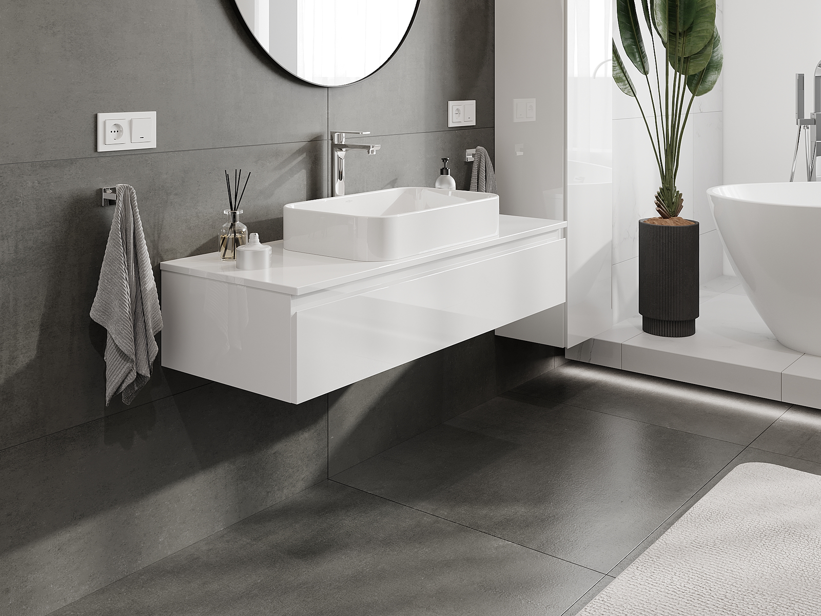 Unsere modularen Badezimmermöbel können in verschiedenen Farbkonfigurationen miteinander kombiniert werden, wodurch eine vollständige Personalisierung ermöglicht wird. Man kann sowohl das Aussehen als auch die Funktionen der einzelnen Elemente auswählen, was es erlaubt, die Möbel an eigene stilistische und funktionale Vorlieben anzupassen.