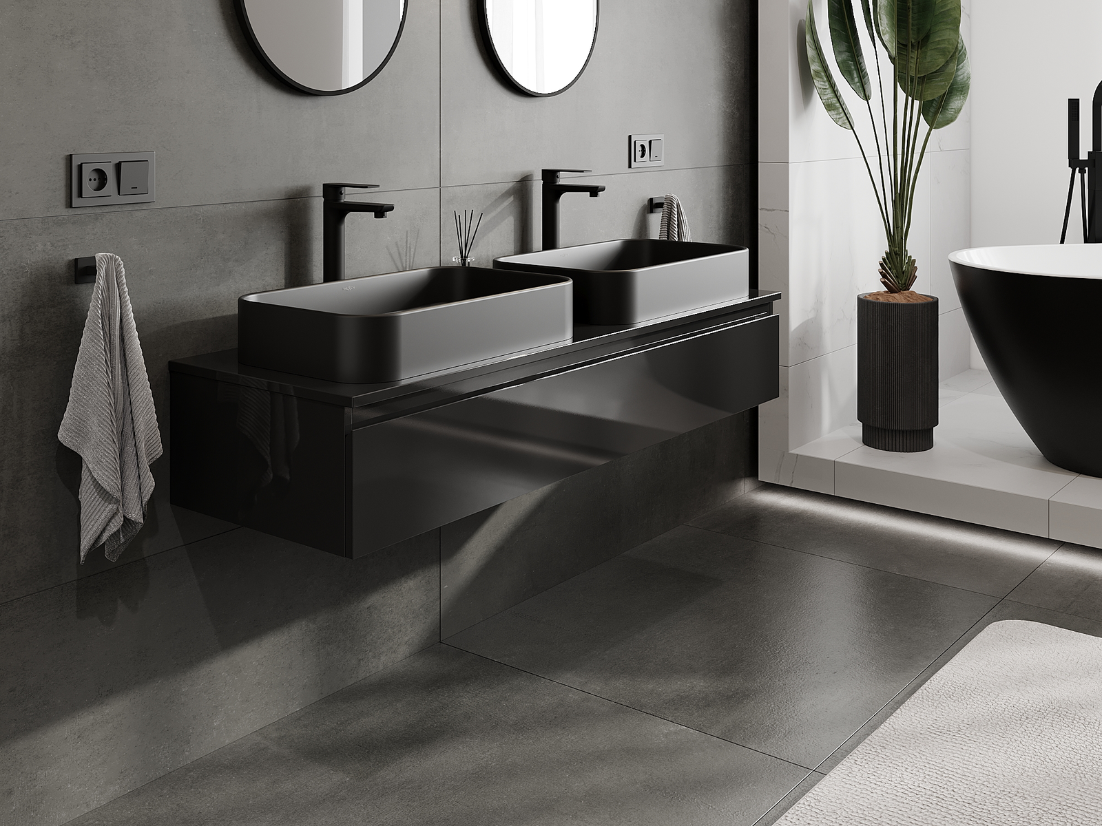 Unsere modularen Badezimmermöbel können in verschiedenen Farbkonfigurationen miteinander kombiniert werden, wodurch eine vollständige Personalisierung ermöglicht wird. Man kann sowohl das Aussehen als auch die Funktionen der einzelnen Elemente auswählen, was es erlaubt, die Möbel an eigene stilistische und funktionale Vorlieben anzupassen.